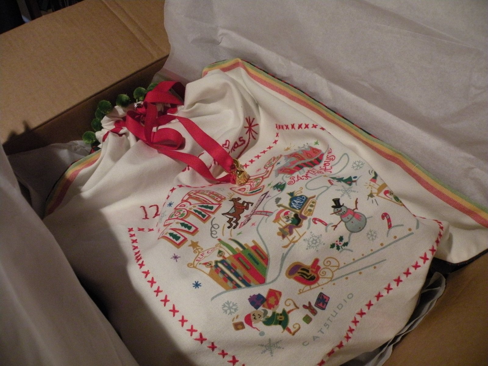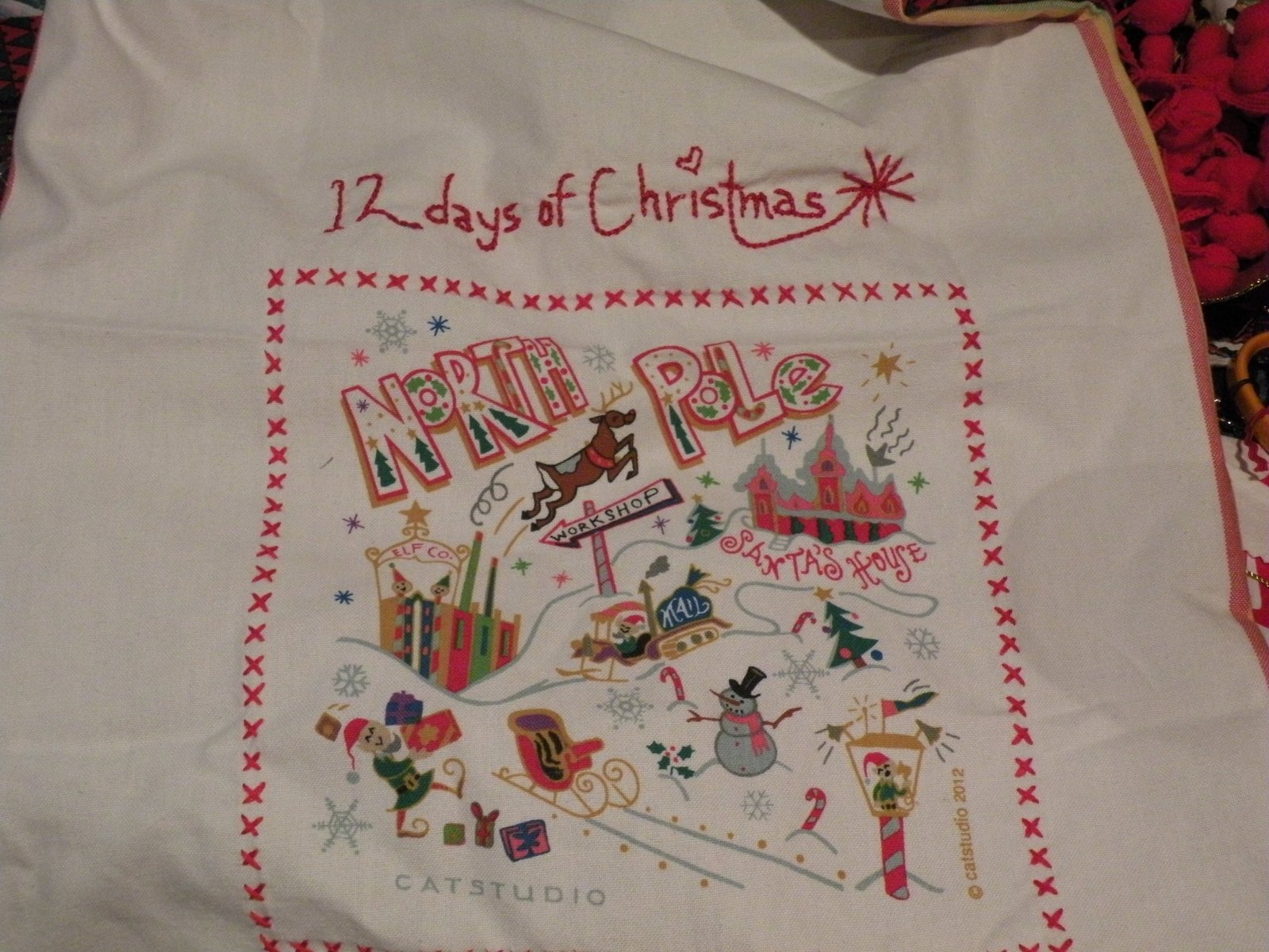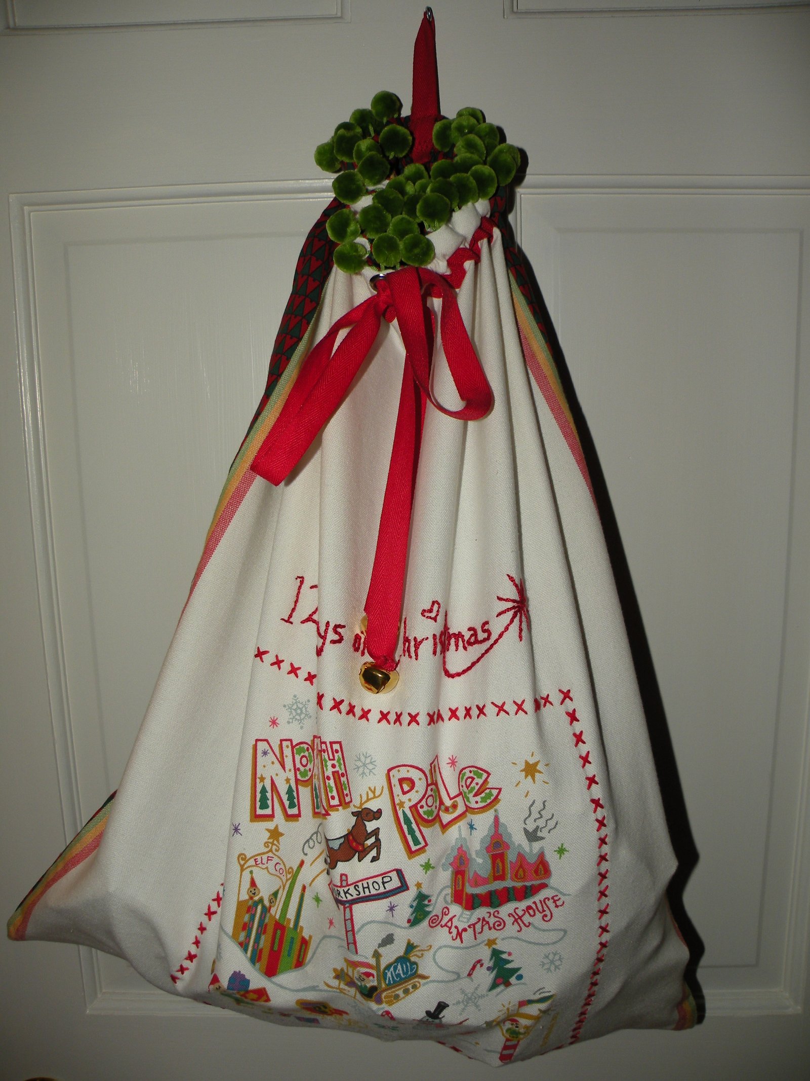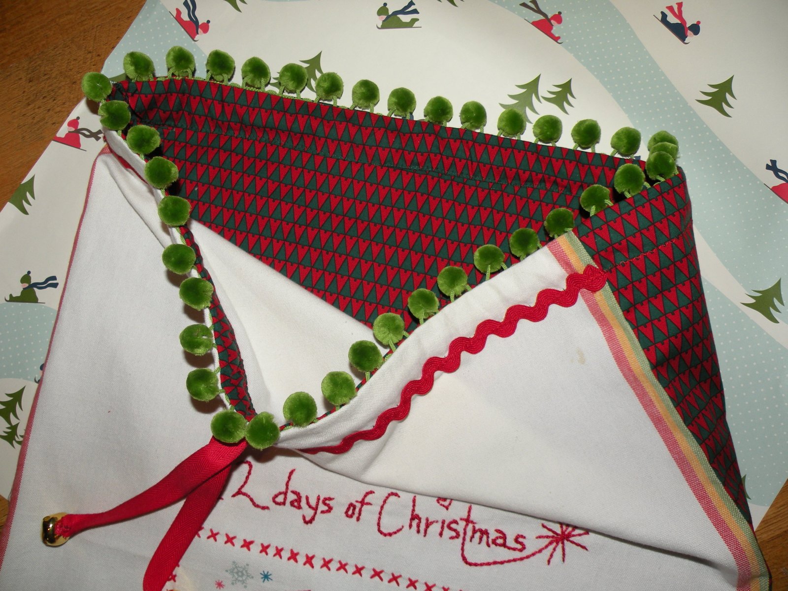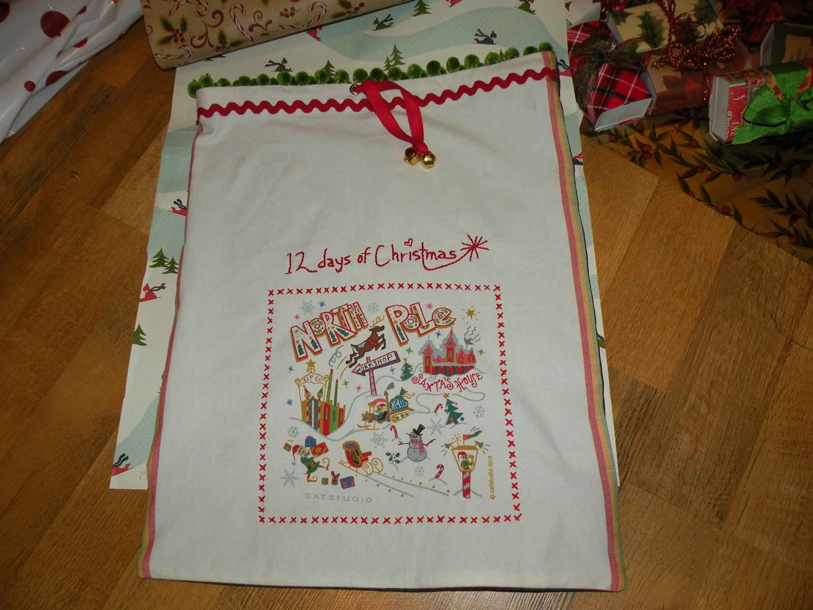 The bag is made from a Christmas kitchen towel I found at Fireworks. It was perfect! The picture was stamped on, but the "x's" were hand-done and it came that way! I added the "12 Days of Christmas" embroidery. I sewed the towel to fabric to make the bag, added a casing, trims and sewed bells on the ribbon ties.