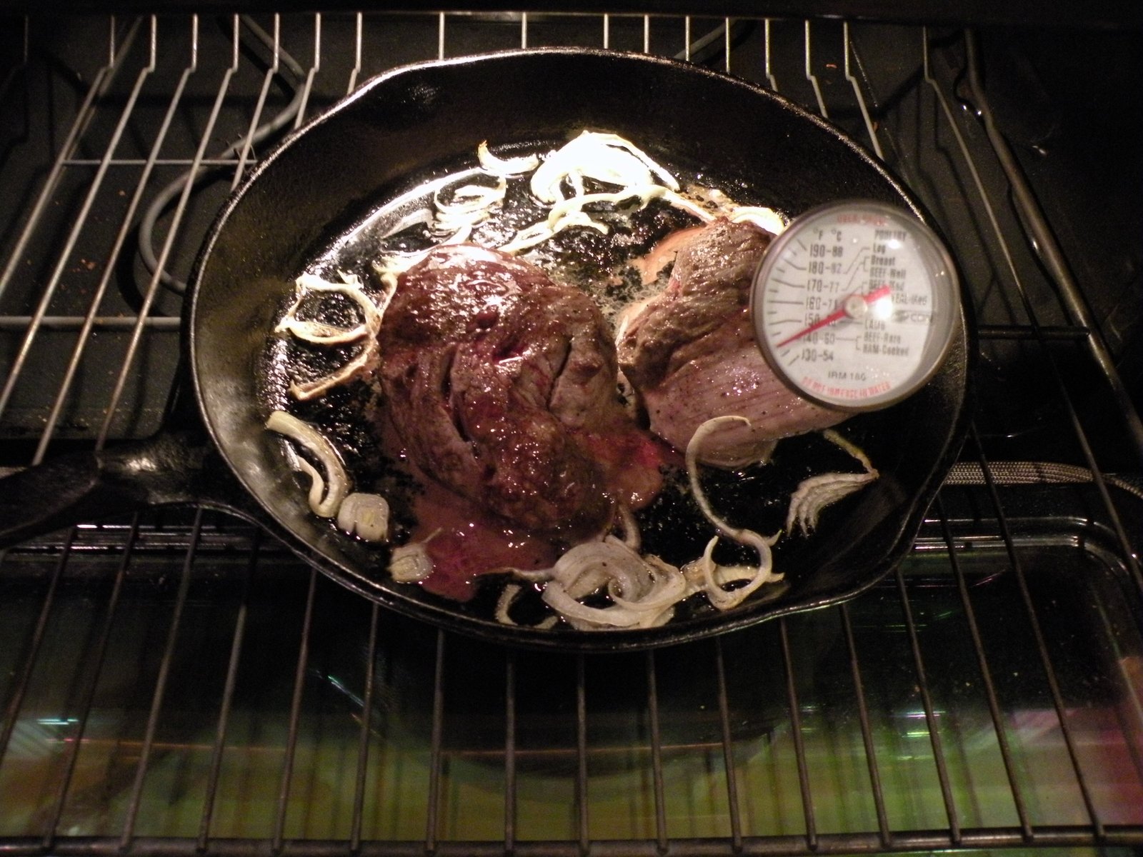 Using a cast iron skillet, I was able to put the steaks in the oven so I could bring their internal temperature up to 140 degrees (which is medium and just how we like them) in about 20 minutes, allowing me plenty of time to prepare a nice salad. When the steaks reached 140 degrees on the thermometer, I pulled them from the oven and put them over high heat on the stove top (!) to sear on each side. And just like that, we had perfect steaks!