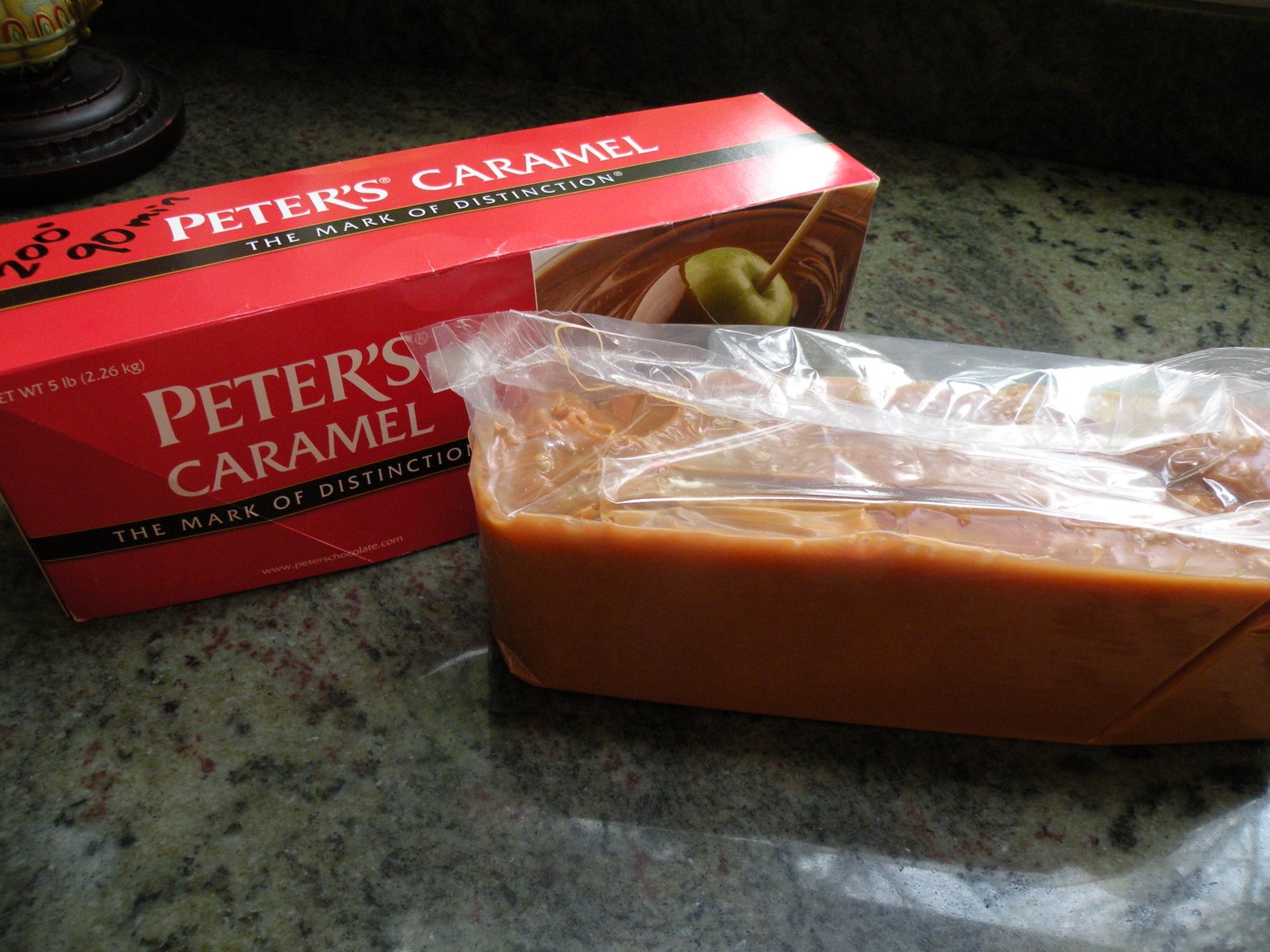 My cousin Barbara (Hi Barb!) introduced me to Peter's Caramel and Gygi many years ago...Gygi is a fabulous kitchen store in Salt Lake City (300 West 3500 South) - think Sur La Table on steroids. And while you can purchase Peter's Caramel at other places, I always get it from Gygi when I'm in SLC...and I order it from them online at well. A 5 lb. brick is $16.99 - and it's worth every penny. In the past I have melted the carmel in a double boiler or in the microwave but this time I took the advice of the check-out gal and put the brick in a glass baking dish in the oven at 200 degrees for 90 minutes...it was liquid gold...smooth and creamy and the perfect temperature for dipping! A 5 lb. brick of caramel will coat 12 to 13 medium apples, with a nice thick coat of caramel!