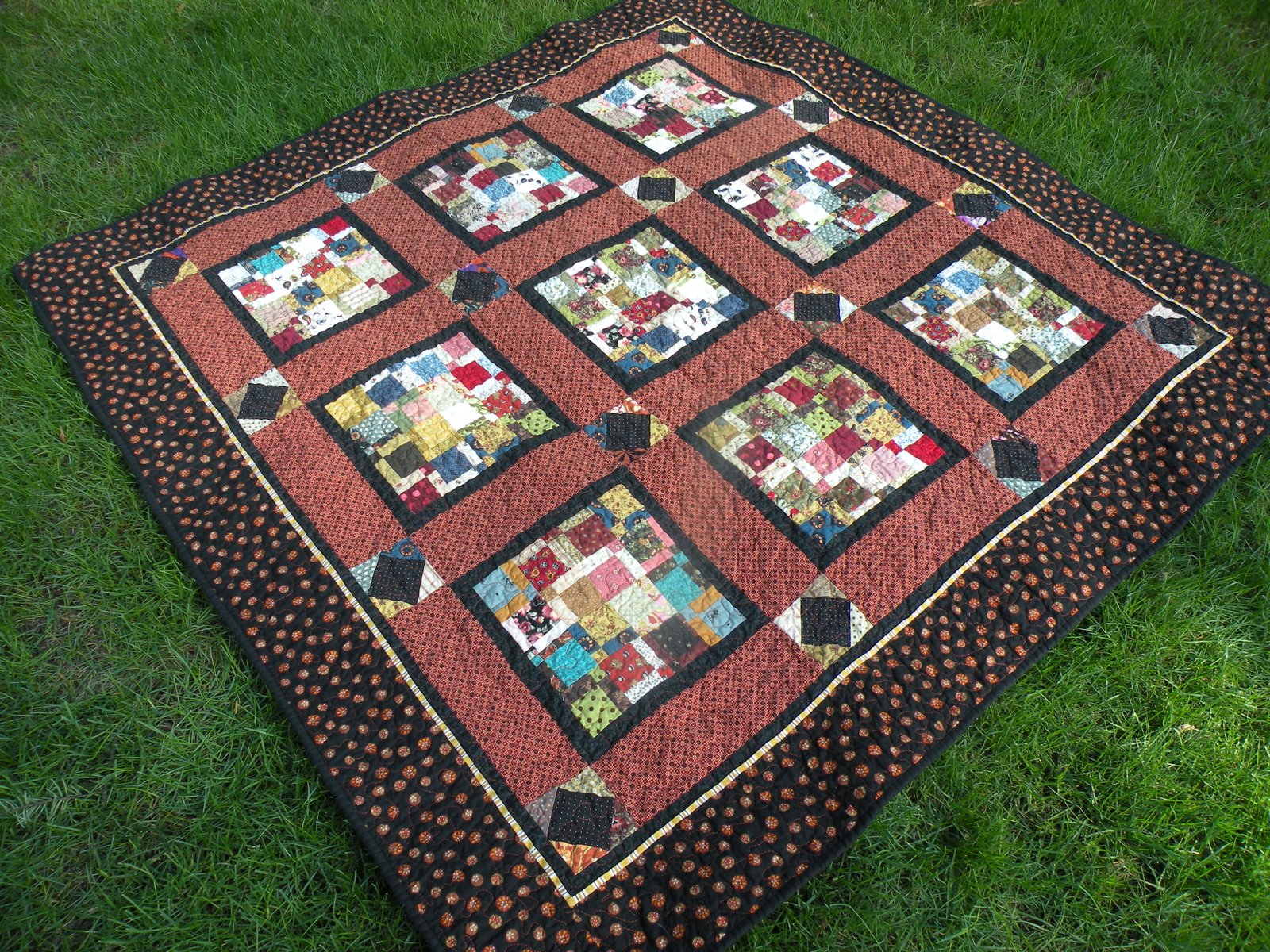 There's a story to this quilt and it's a strange one! Years ago our quilt group made "ugly 9-patch" blocks and exchanged them...I made a quilt out of my set and love it to pieces. Lori opted not to use her blocks and gave them to me and I decided instead of another 9-patch quilt that I would cut those blocks into smaller blocks and then resew them...then the ugly fabrics would be smaller and less noticeable, at least that was the goal.