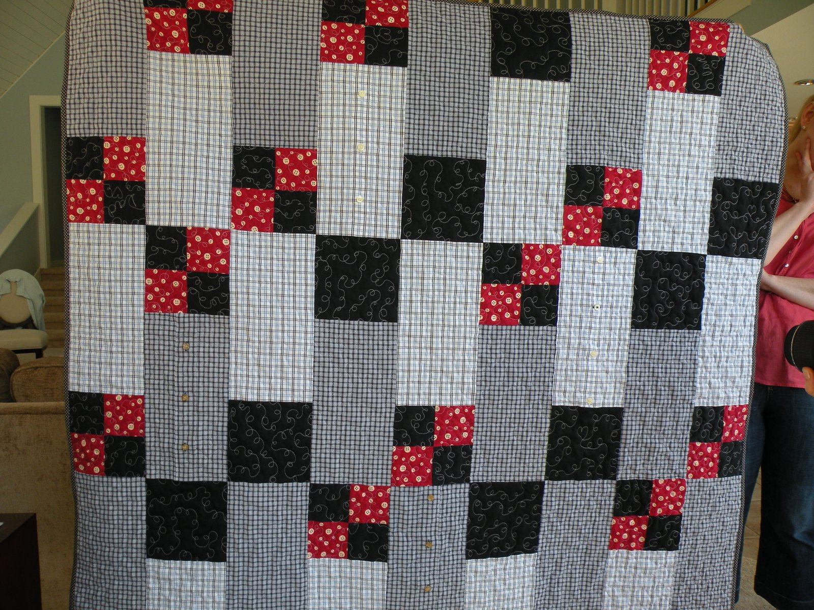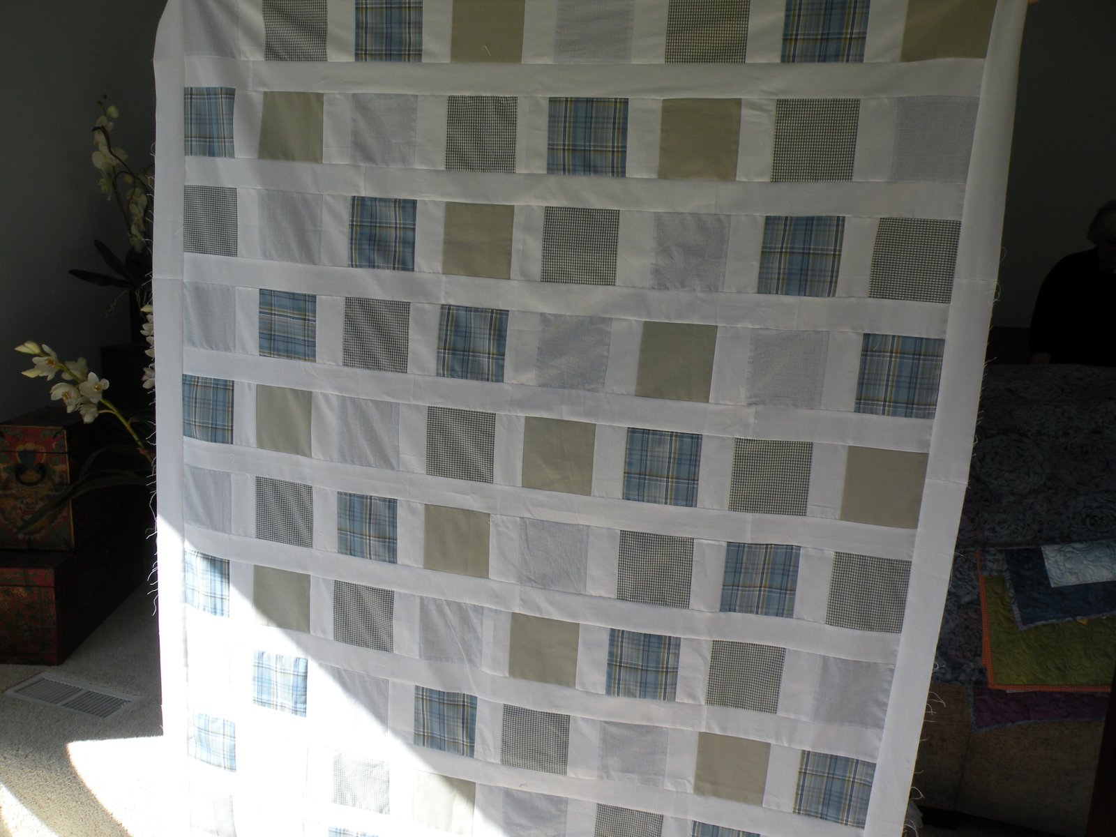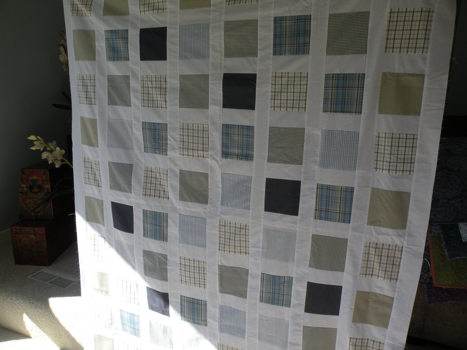 These are two more of the quilts for the family. The quilt on the left was made by Barbara and has been quilted and bound - Barbara added in the red fabric, but all of the other fabric is from the shirts. If you look closely you can see Barbara used the button-fronts of the shirts - very clever! The quilt on the right was pieced by Kareena, it's also been quilted and bound. I know this family will love these quilts and hopefully they'll get some comfort from them.