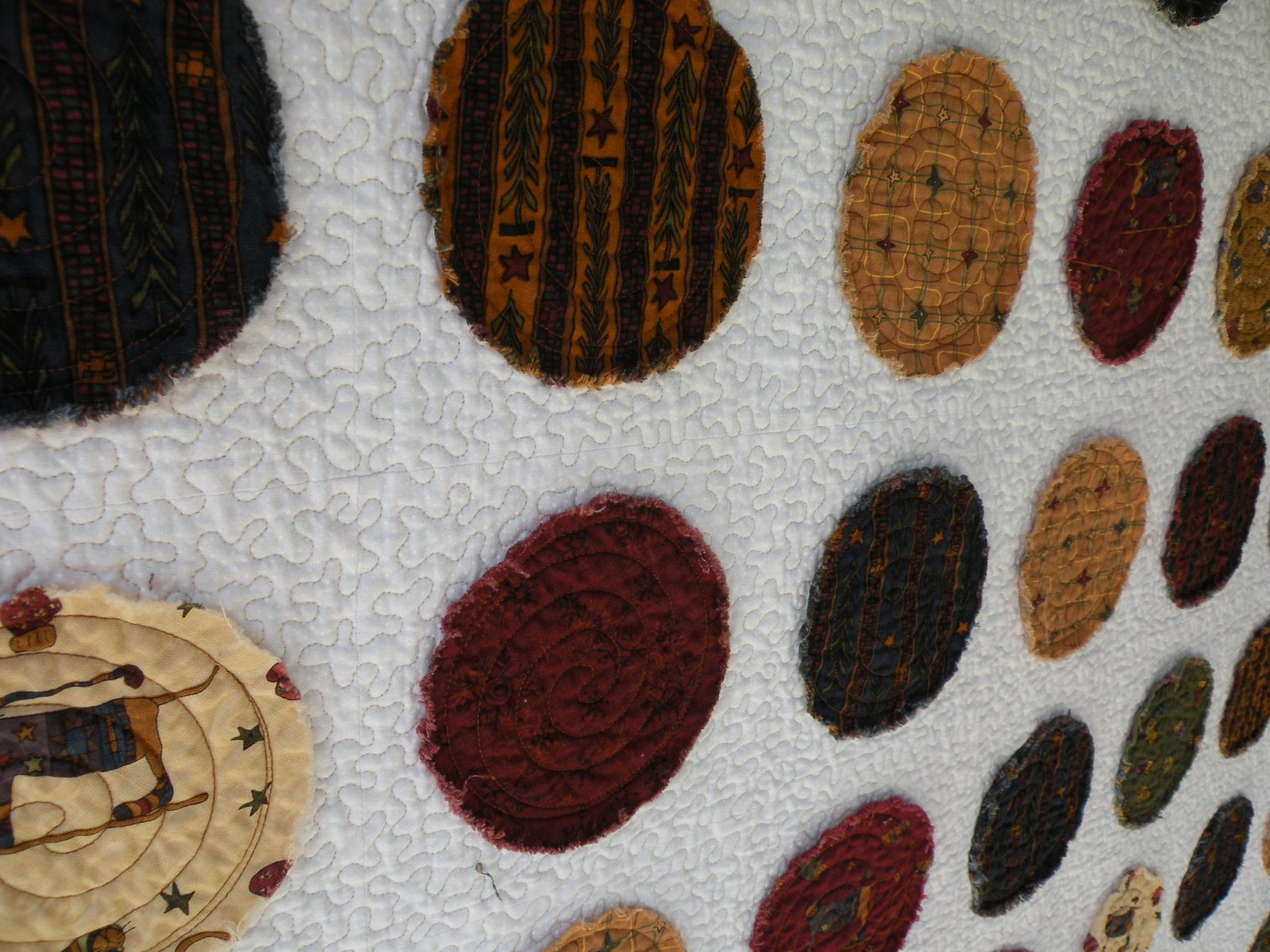 This quilt by Terry is so deceptive! Doesn't it look like she used fleece in the background? Well, it does to me! Terry machine-appliqued on the circles, on her long-arm, I don't know how that was possible but she does the impossible all the time. And the circles are raw-edge! Yet another fabulous circle quilt!