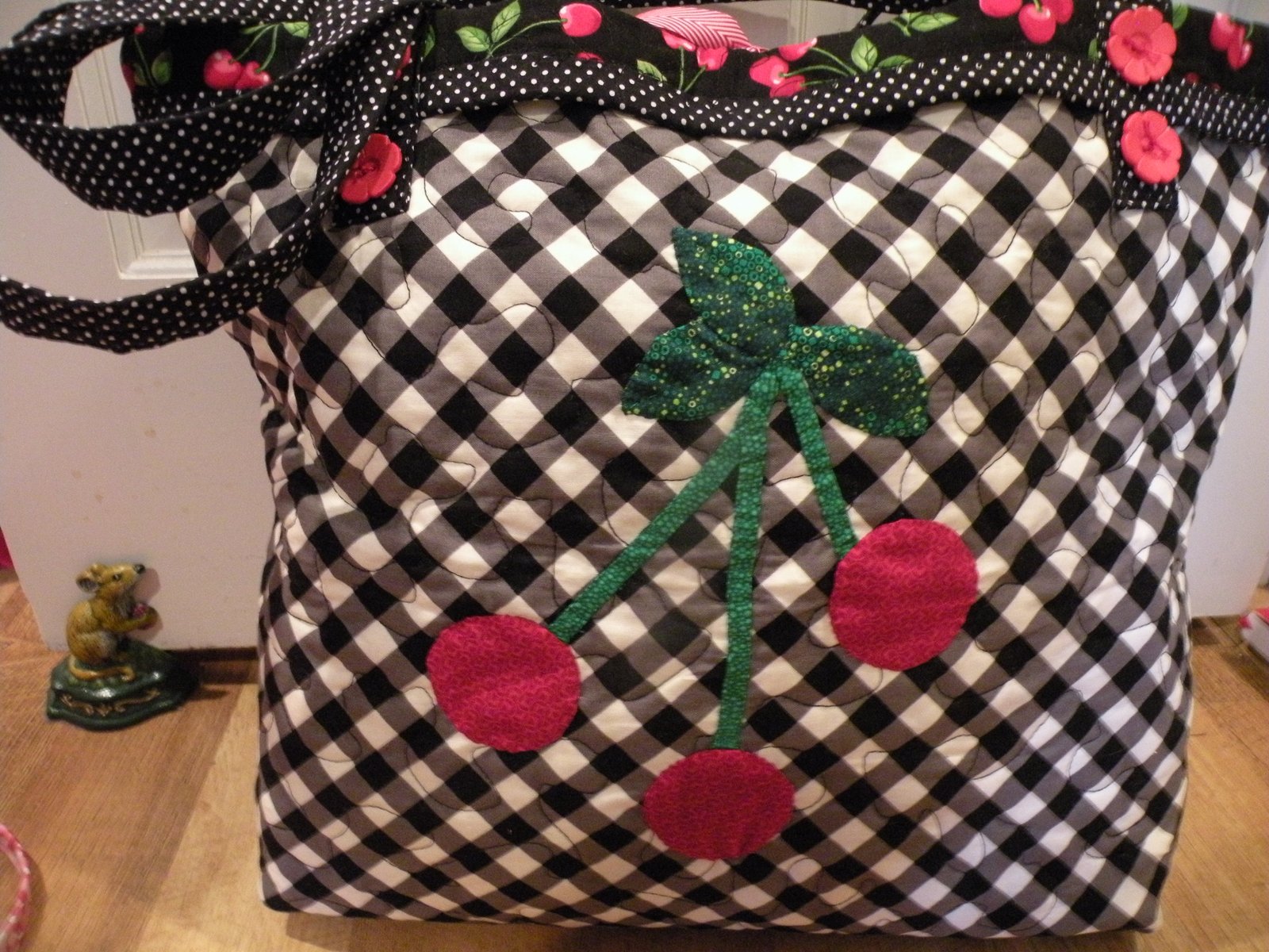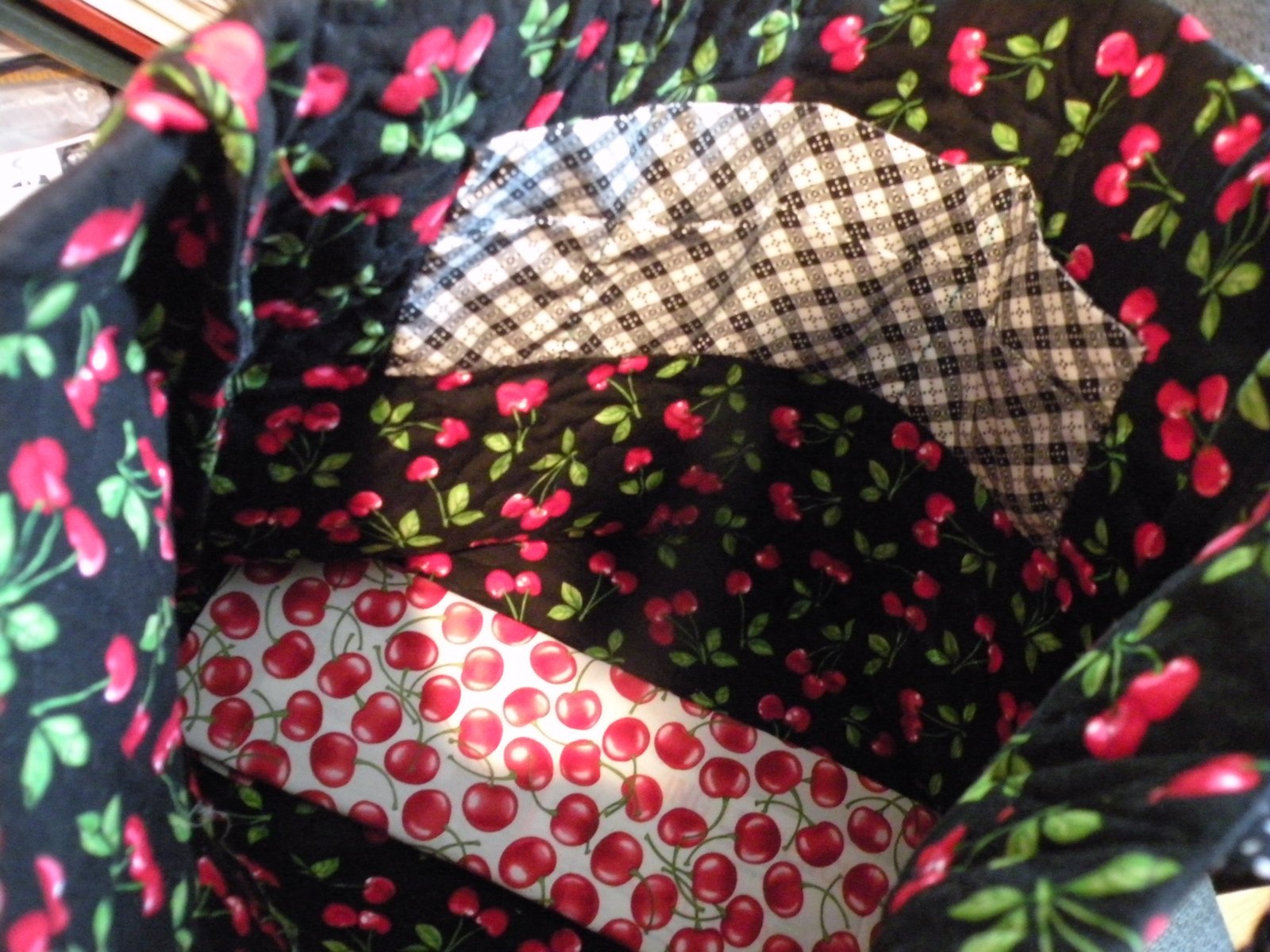 Only one side has the hand-appliqued cherries - and I kind of like the other side naked. I'm going to keep this tote in my car and I will try to remember to take it in with me when I hit the store/mall, then at least my purchases will be carted in style and I'll feel SO much better about saving the environment! Whatever.