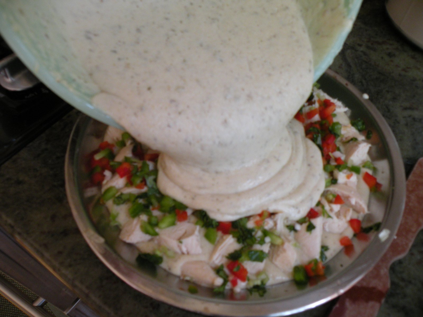 Spread half the batter in the prepared pan. Evenly scatter the chicken, red and green peppers, cilantro and onions on top, then cover with the remaining batter, smoothing it evenly to the sides. Place the baking dish in a larger pan, transfer to the oven and pour boiling water into the larger pan to about halfway up the sides of the baking dish. Cover both pans with a piece of foil. Bake until set, 45 minutes to 1 hour. Let stand, covered, for 10 minutes (don't skip this step!) To serve, cut into slices and spoon several tablespoons of Black Mole over the top. Serves 8.