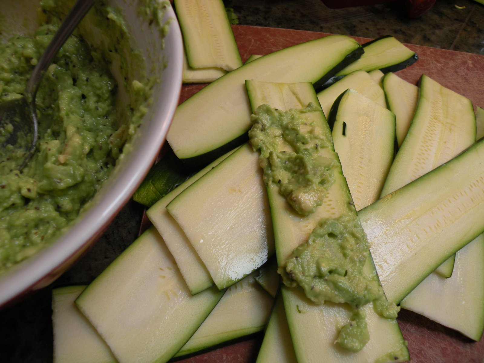 To assemble: Coat one zucchini strip with about a teaspoon of guacamole. Layer on a few carrot, radish, and cucumber strips. Sprinkle with cilantro and mint. Roll up, keeping all of the veggies on the zucchini and secure with a toothpick. Makes 24.