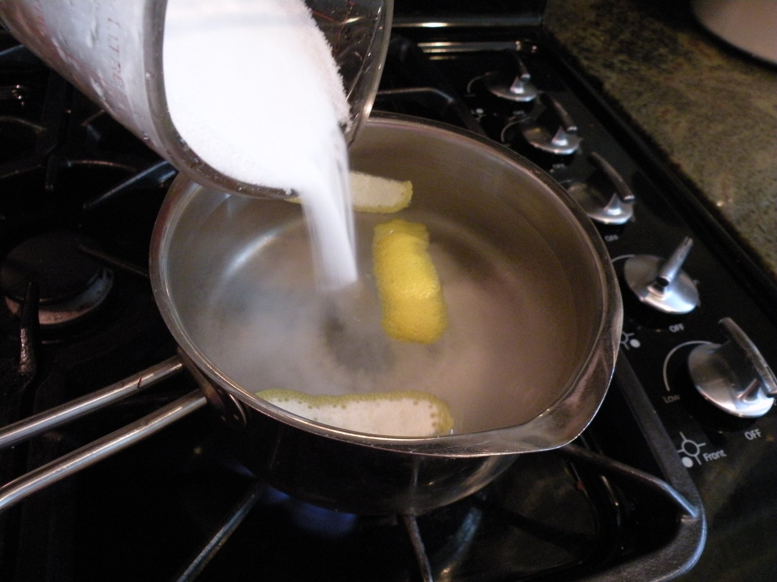Remove 3 strips of lemon peel from one of the lemons. In a medium pan, combine 4 cups water, sugar and lemon peel. Stir frequently until sugar dissolves, bring to a boil, cover with lid and boil for 3 minutes. Remove from heat.