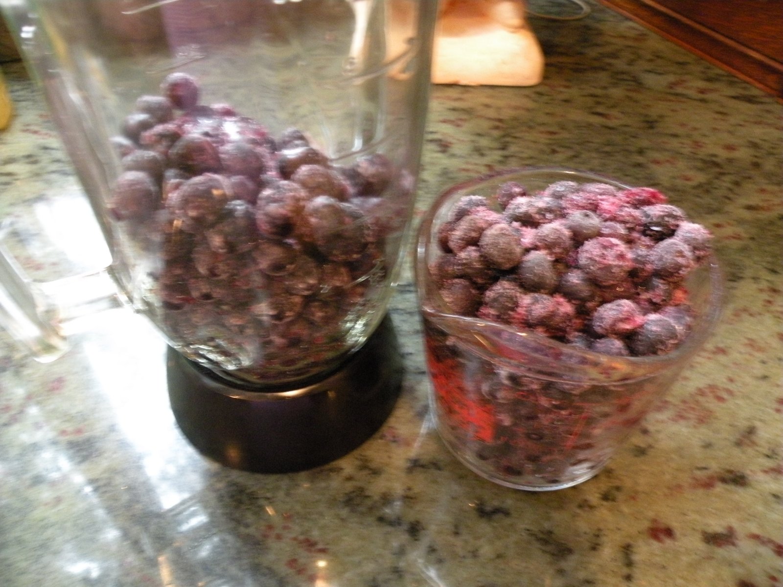In a blender, combine the frozen blueberries with 3 cups of cold water, puree. Pour pureed blueberries into a clear pitcher (you'll want to see the pretty blue color!) Remove the lemon peels from the sugar syrup and discard. Add the sugar syrup to the pureed blueberries, stir in the lemon juice and add the remaining cup of water. Stir to combine. Makes 12 cups. Pour over ice and serve with a sprig of mint - sip leisurely with your feet propped up!