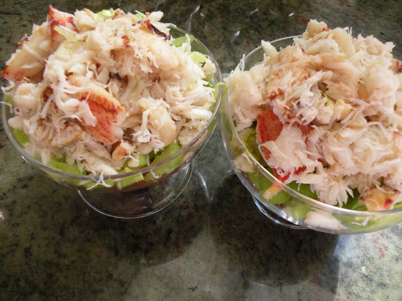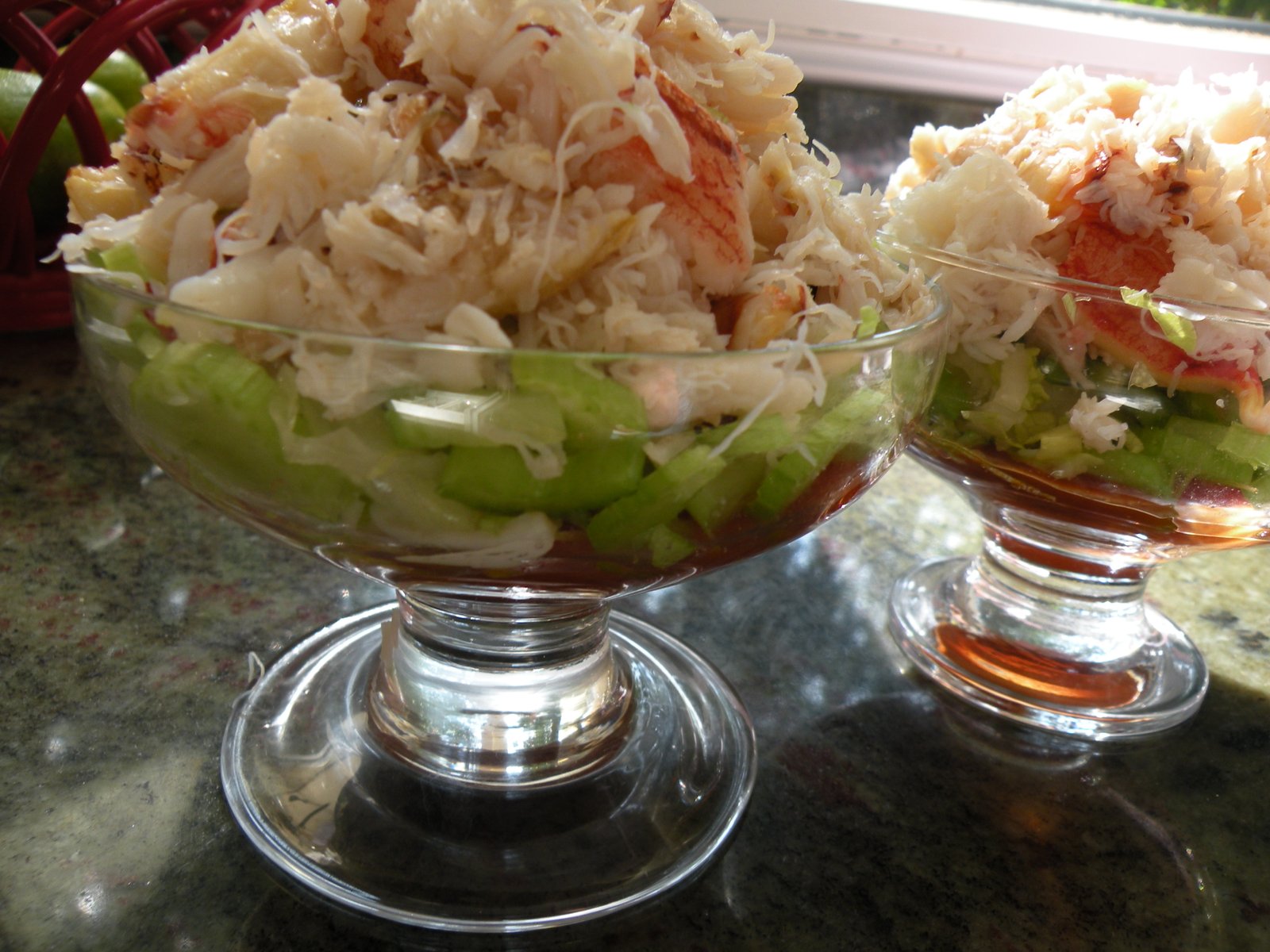 This is as easy to make as it looks...shredded iceberg lettuce with thinly sliced celery on top, followed by a 1/4 pound of fresh Dungeness crab and all of it sits on a base of zesty cocktail sauce. We eat our crab with a lime wedge squeezed on top...much better than a lemon!