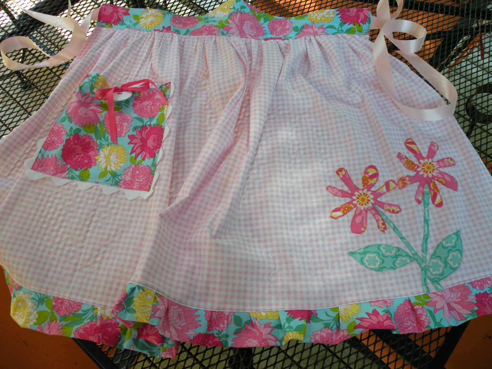 Do you see the stack of books with the apple on top? This apron is for Carol's friend who is a teacher...all of the aprons have machine-applique and ribbon ties. And as you can see, all are made from pink checked fabric with coordinating prints.