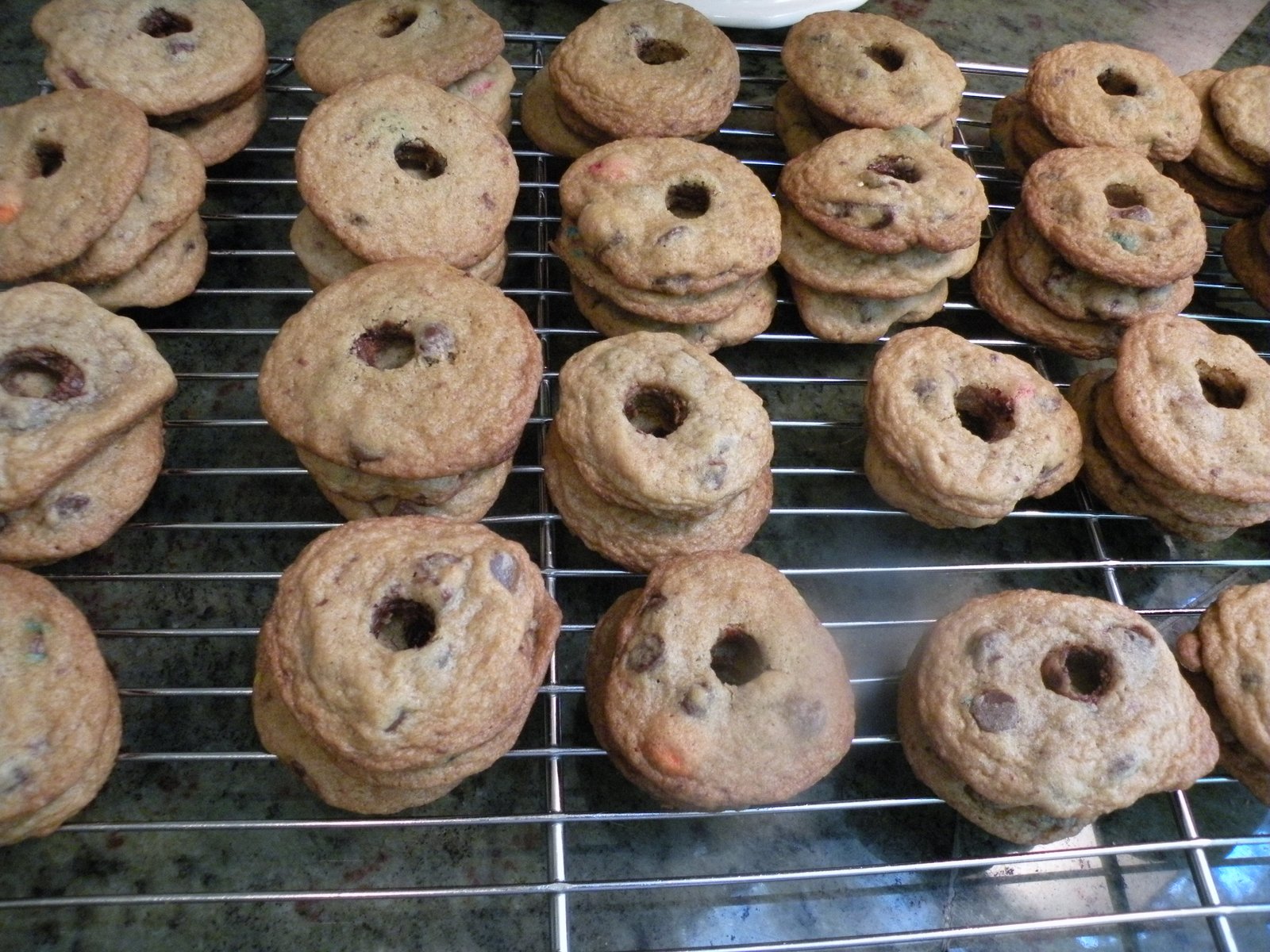 You will need a big straw. I have some large "smoothie" straws I purchased at a kitchen store and they worked great. They are made of plastic so they didn't bend, do not use paper straws, they won't work with hot cookies! You will also need some fresh-hot-from-the-oven home-made cookies; I made chocolate chip cookies. As soon as the cookies come out of the oven, insert the straw into the center and lift - that's it! Instant hole! The cookies will still be soft so you need to work quickly, making the holes before they crisp up. You don't need to worry about extracting the cookie part from the straw - just keep making holes and the centers go up into the straw, which you can squeeze/rinse out later.