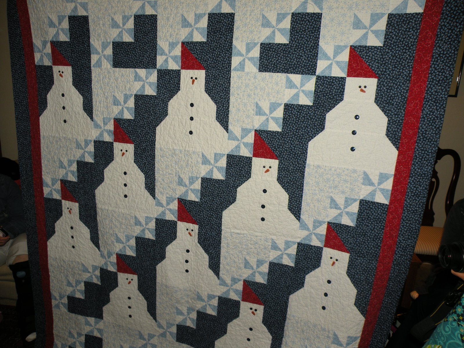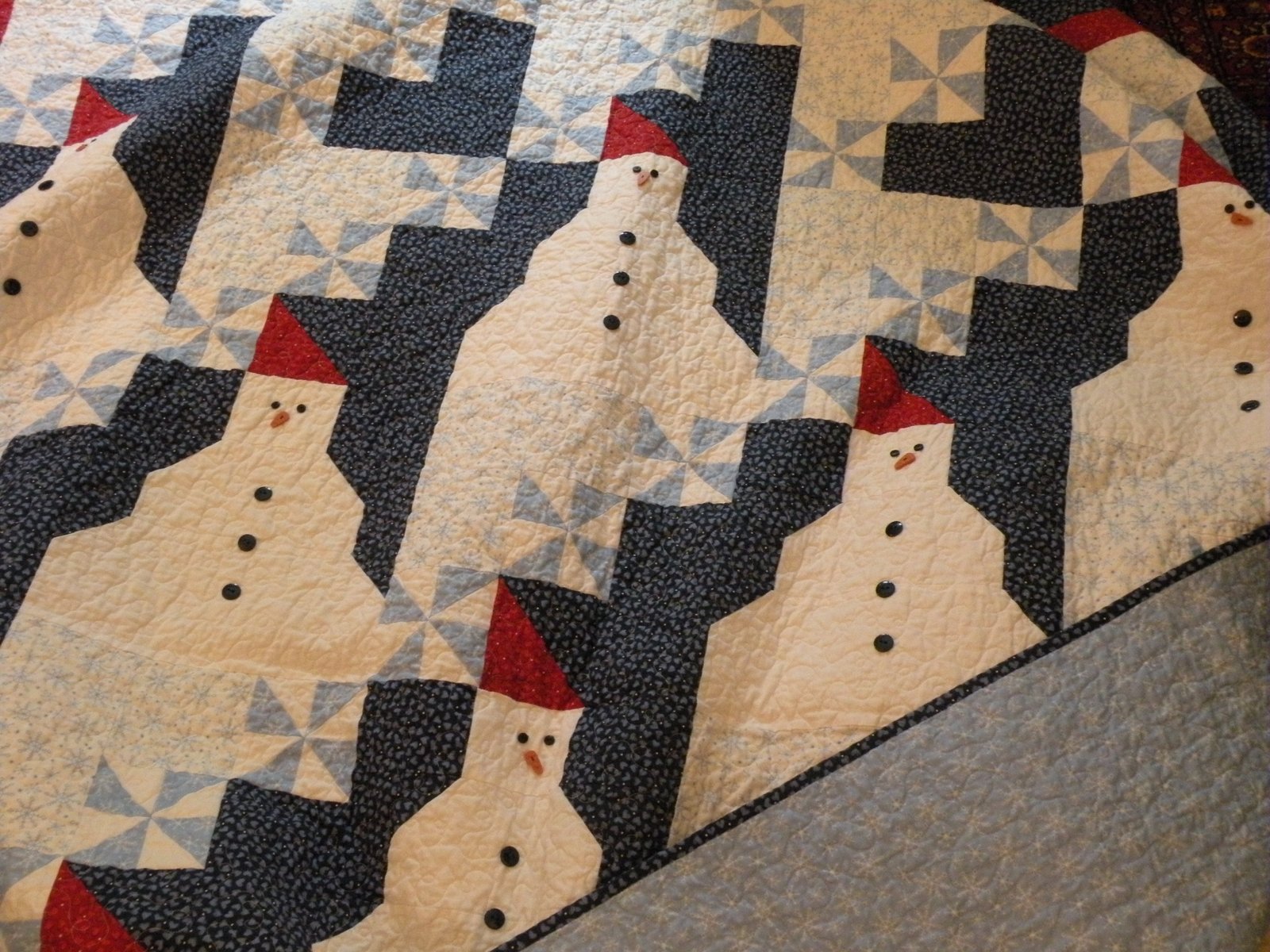 Kareena made this quilt, too, and I've shown it here before but this time it's finished, complete with the eyes, carrot noses and buttons...such cute little snowmen. You can find the pattern here, it's called Snowman Snow Day and it's from A.E. Nathan Company. The pattern was posted as a free pattern on Quilt Inspiration blog.