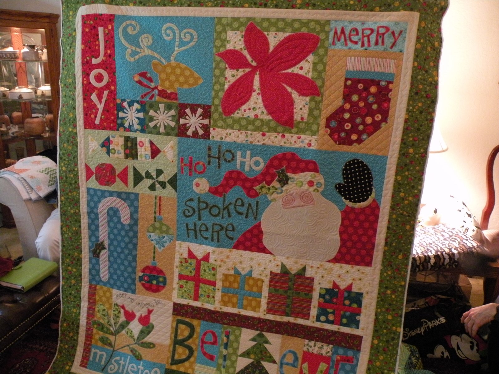 Now the quilt above, another of Kareena's masterpieces, IS a favorite! It's fresh from the quilter so it's not bound yet, but I can just imagine being wrapped up in this quilt while watching a Hallmark Christmas movie...too bad it's not mine!