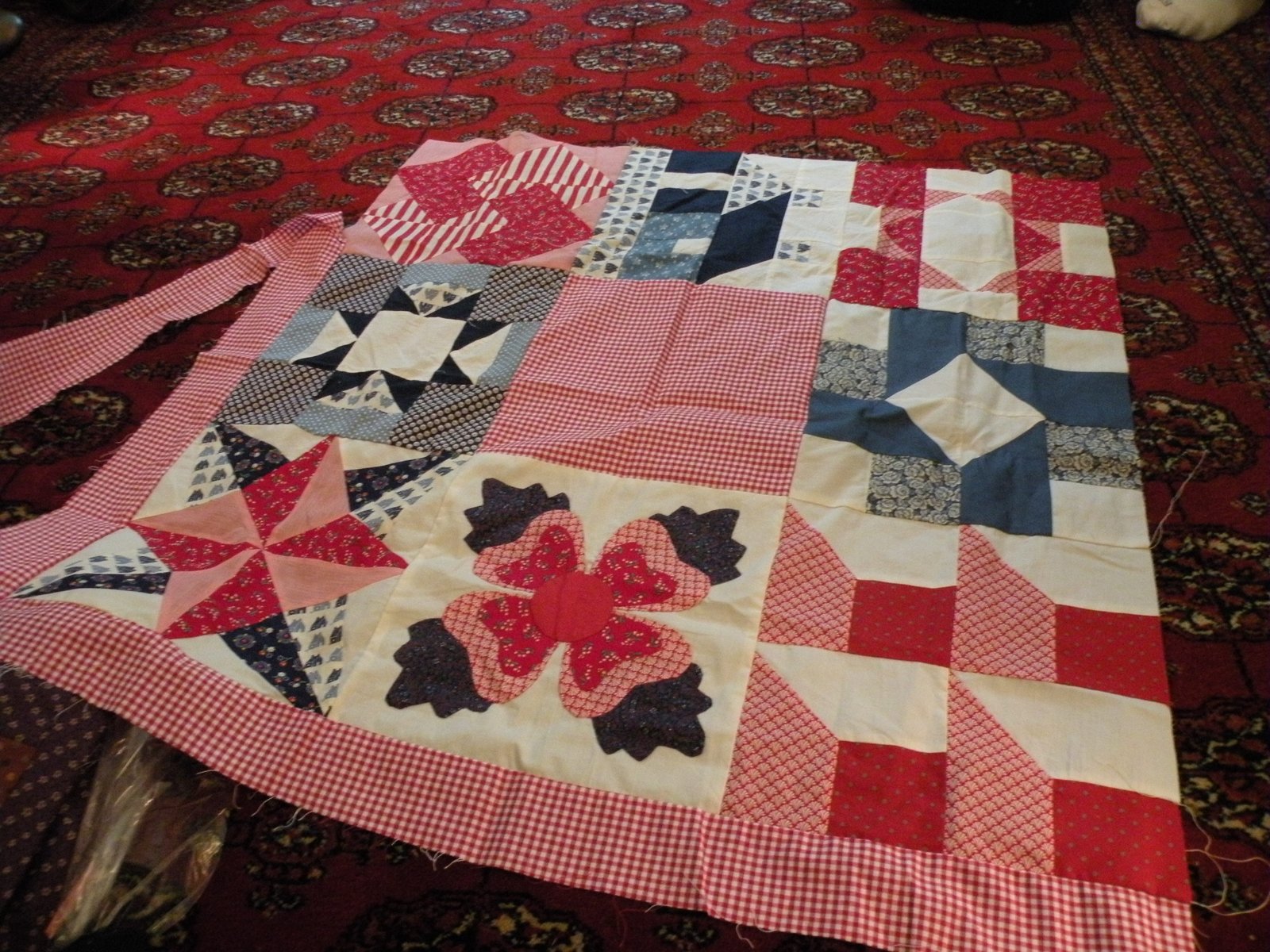 This little vintage quilt was something that was donated to Project Linus. It's been tied to the batting, which isn't really batting but some kind of fusible that is incredibly stiff. Stephanie over-saw the Day of Service where quilts were made for Project Linus and she brought in this quilt to ask our group what to do with it. After a bit of discussion it was decided it should be removed from the backing and machine quilted, which yours truly offered to do. I'm a sucker for vintage quilts - even if they're not mine, plus I wasn't able to help with the Day of Service (on September 11th) so this can be my contribution...I need all the brownie points I can get!