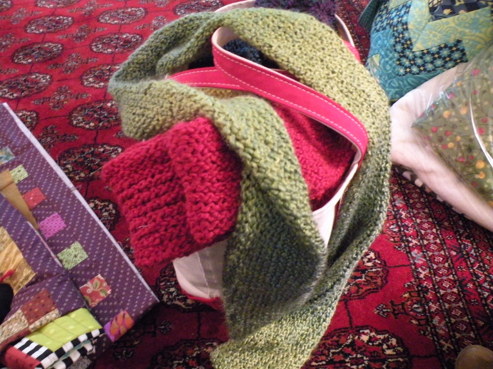 The little quilt above is another Project Linus quilt, made from orphaned blocks. Stephanie is just putting on the border and will finish it up. Stephanie also brought in a huge back of knitted scarves to show us - she is donating them to a shelter. If you look up the word generous in the dictionary, you'll find Stephanie's name in bold letters.