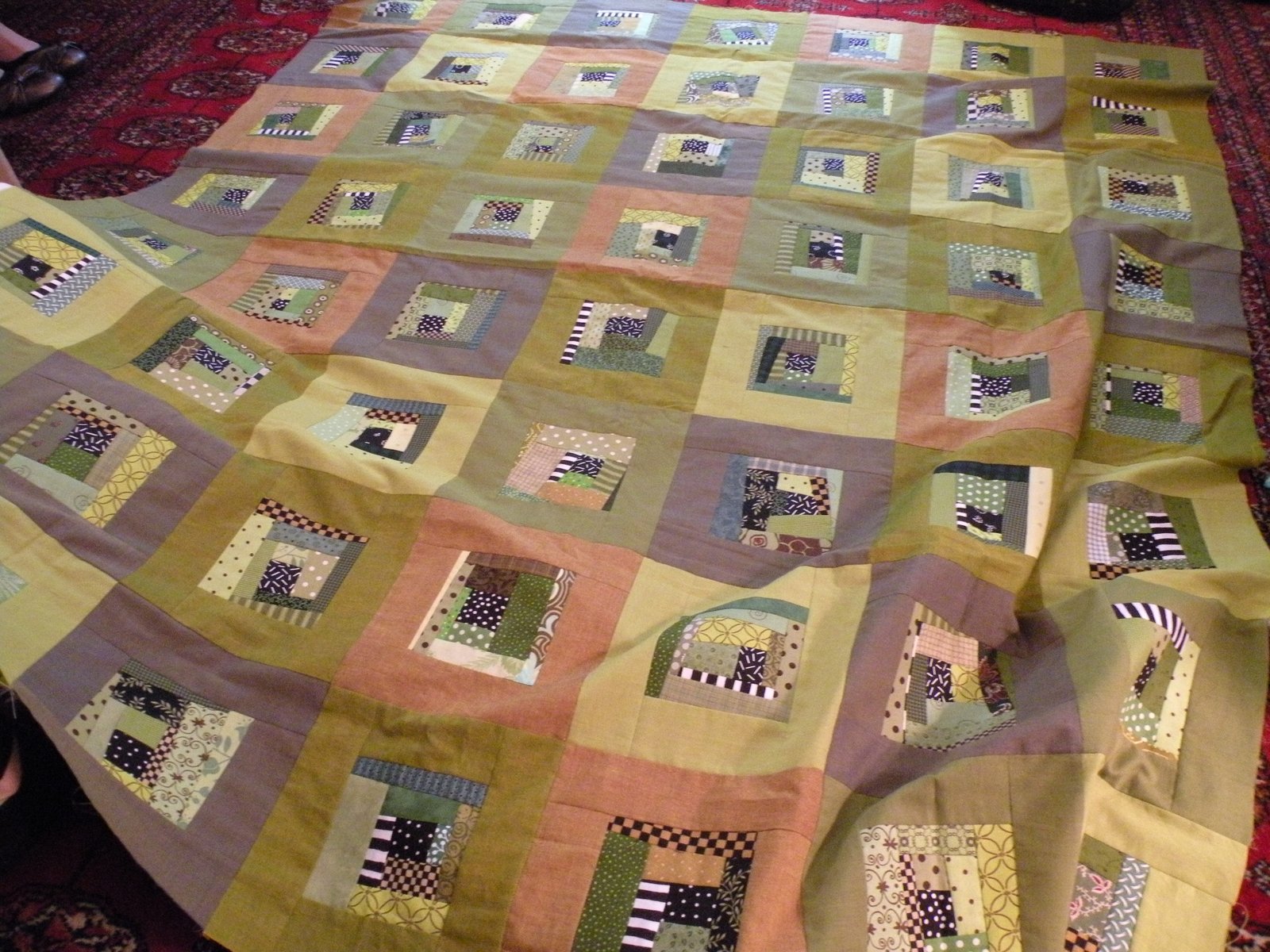 This is Stephanie's version of our group's ugly-quilt-block-quilt. Years ago we all made blocks for each other out of fabric we didn't particularly like...using up our ugly fabrics. If you look at some of those blocks individually, you'll instantly see why they are called ugly blocks...but this is a great quilt! Most of us have our own version of this quilt and I can honestly say my ugly-block quilt is one of my favorites!