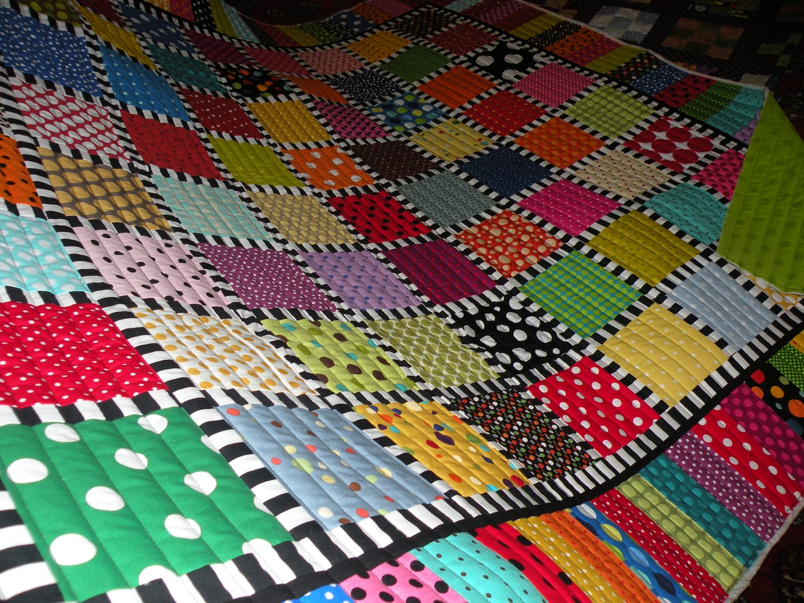 One year ago we had a quilt group retreat at Barbara's cabin. While there Stephanie pieced this top and I can't really remember what the deal was but she wasn't happy with how the black and white stripes turned out - so she re-did them...and now it's done - amazing, no?