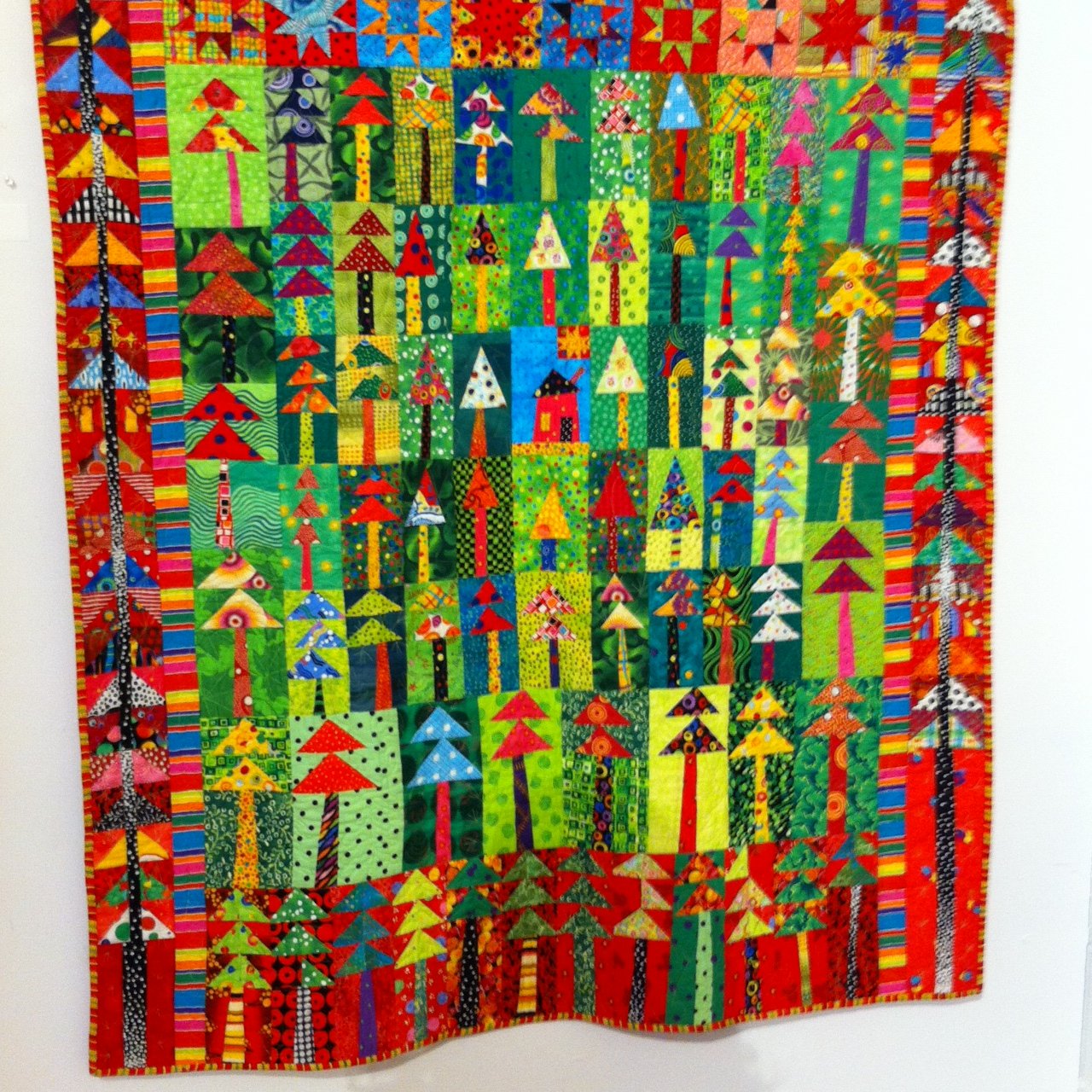 I've saved the best for last...really, this is my real favorite Freddy quilt. Trees!! Red and green and Christmas all over - at least to me...this quilt, with it's "flying geese" border is definitely my favorite...think I might have to make myself one - or maybe I'll make one for the mister so when he goes in for an eye-exam he can say his eyes bleed from looking at bright and crazy quilts because I know there is NO way he'd ever confess to walking into air-freshener!