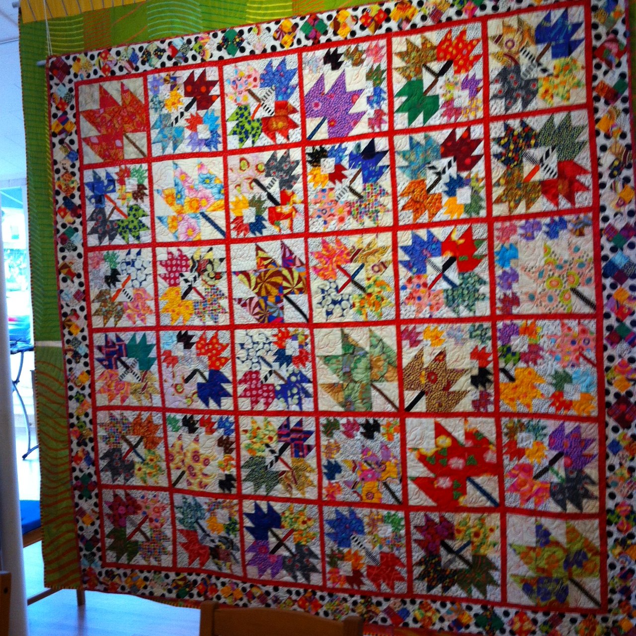 Autumn leaves like I've never seen before! (There isn't a green border around this quilt, that's another quilt hanging behind.) I would love to use that quilt on my Thanksgiving table! Now that's a conversation starter!