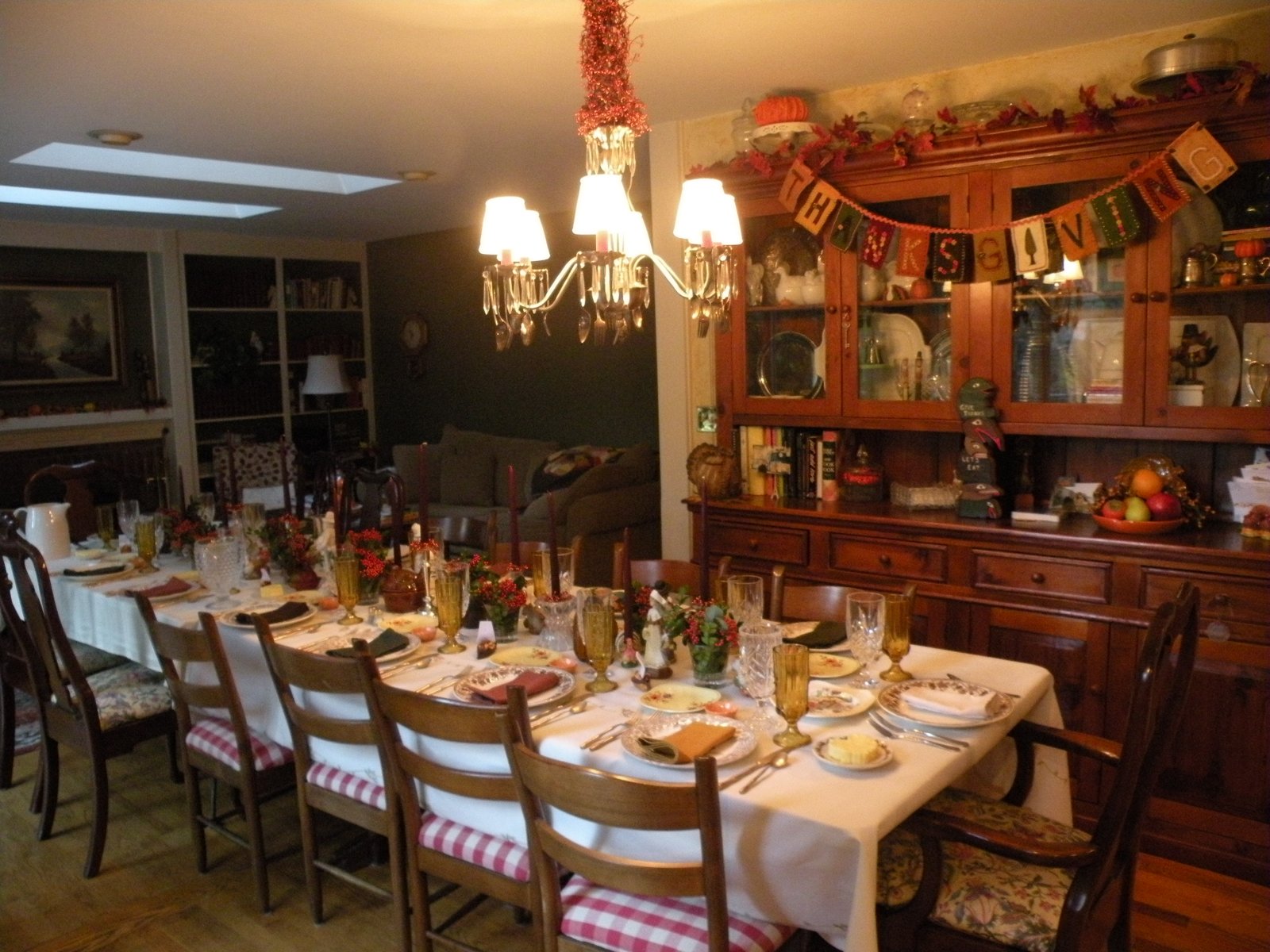 We couldn't fit in the dining room - I tried moving the table at an angle, corner to corner, and adding card tables to fit everyone but they would be like prisoners - once seated they would not be able to move. Having everyone in the kitchen was the only way to make things work - and people like being in the kitchen, right? In my next life I'm going to have a huge dining room!
