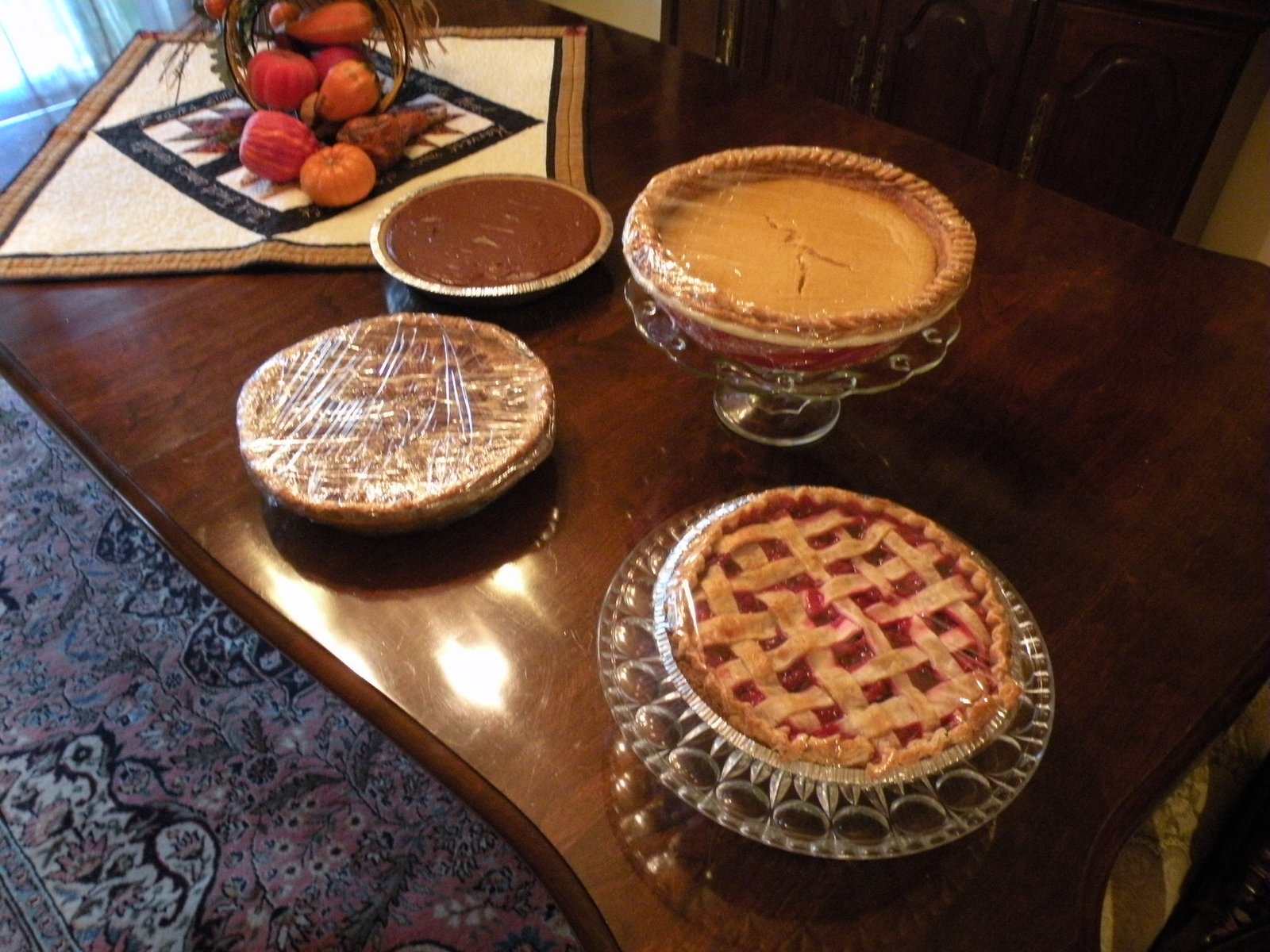 Only the pies are in the dining room...Pumpkin, of course, Pecan Coconut, Chocolate Cream and Raspberry-Cherry - plus Julie is bringing her famous apple pie with rum sauce! That should finish everyone off nicely! Still need to whip the cream...I have 2 quarts - do you think that's enough? Notice my rug? That was a gift from my parents - they bought it in Turkey a long time ago ...it's so beautiful and I have loved having it here - reminds me of them. Can you tell I'm missing them?!?