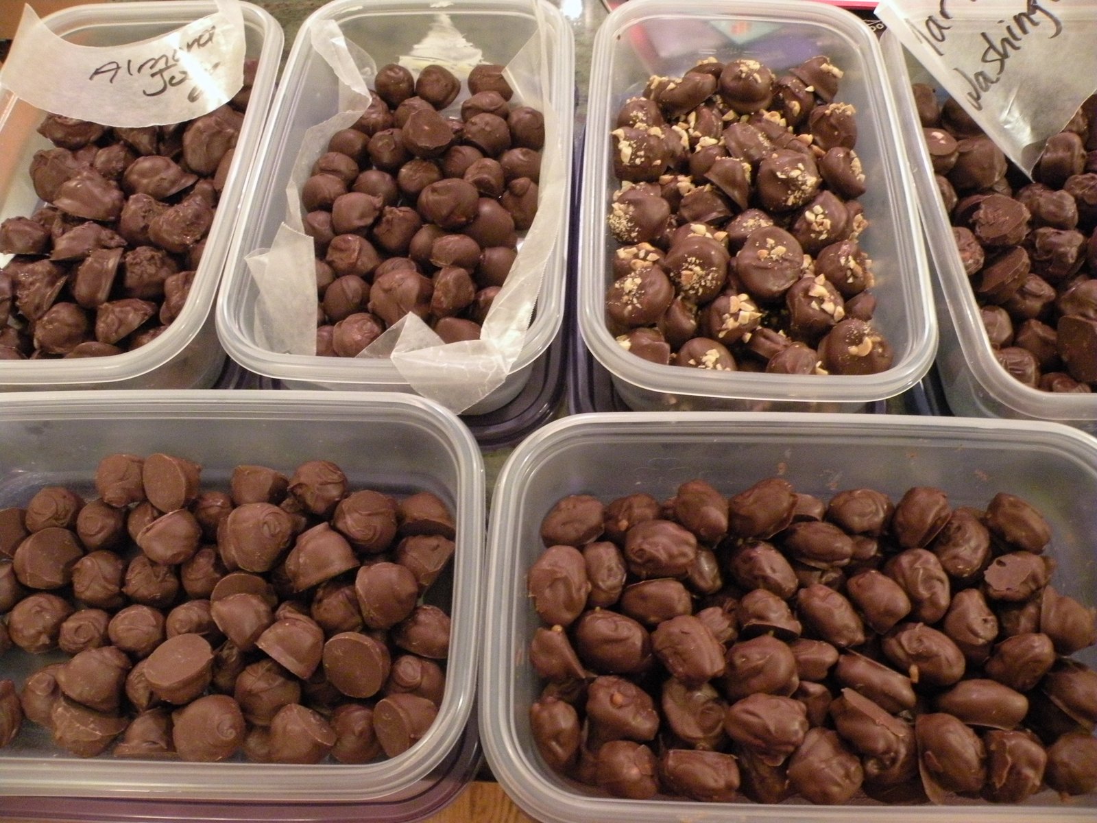 We also had helpers...Linda and Katie kept us organized and more importantly, kept the chocolate organized! Unlike Forest Gump ("Mama always says, life is like a box of chocolates, you never know what you're going to get!) we actually know what's in each container!! They also put all of the toppings on before the chocolates set...sea salt, shredded coconut, chopped peanuts, etc. Couldn't have done it without them!