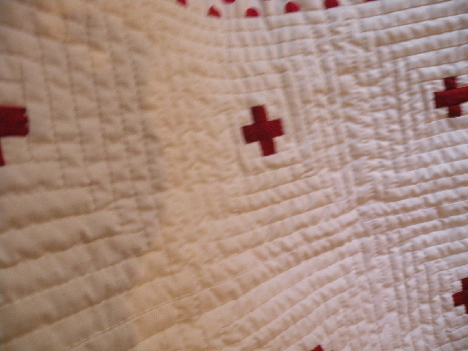 Get your glasses and take a really close look at this - or better yet, click on the pics to enlarge them...Helen finished her red cross quilt and it's all hand quilted! HAND-quilted! In a word? Stunning!