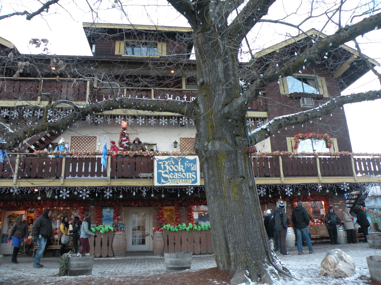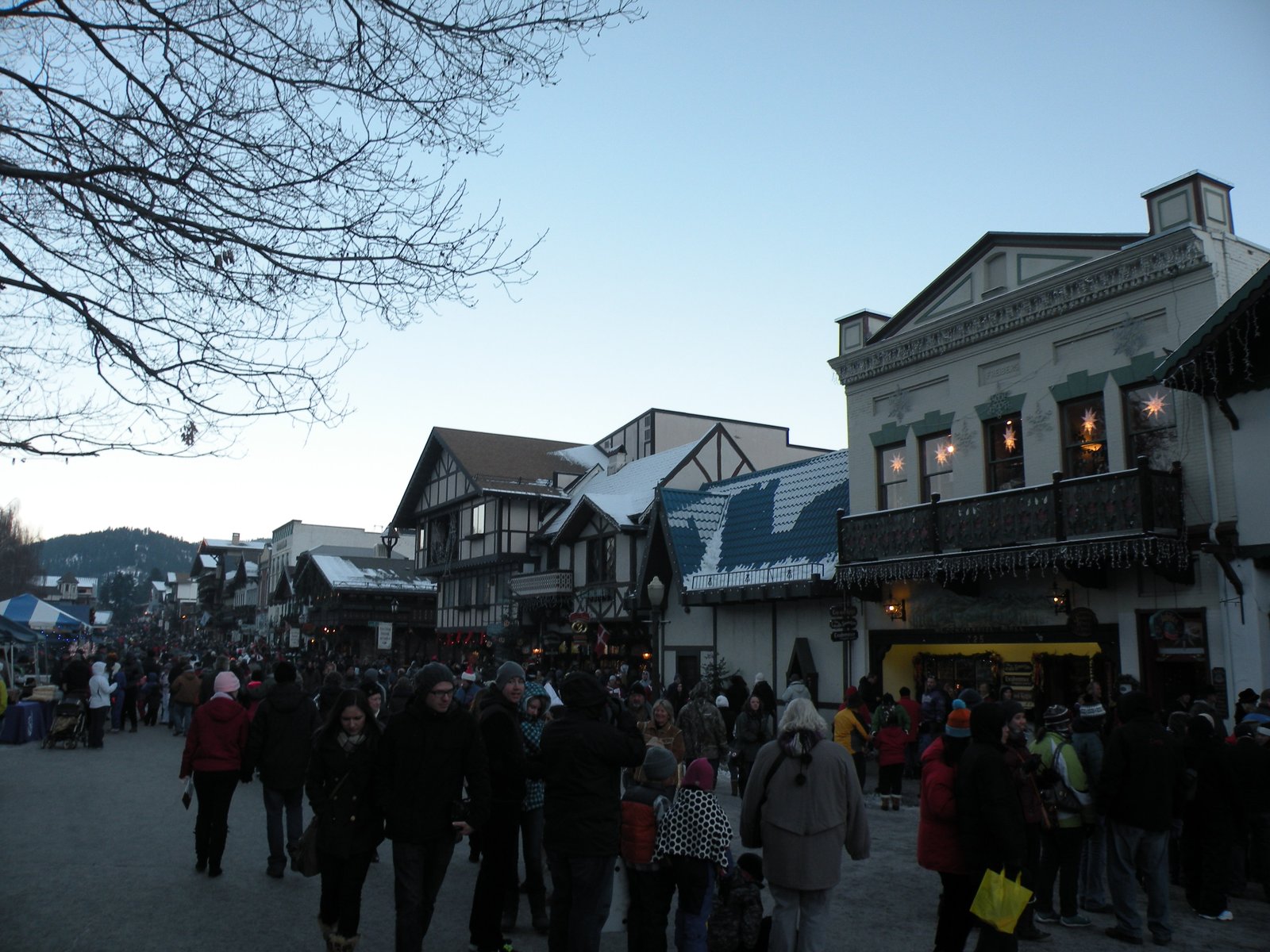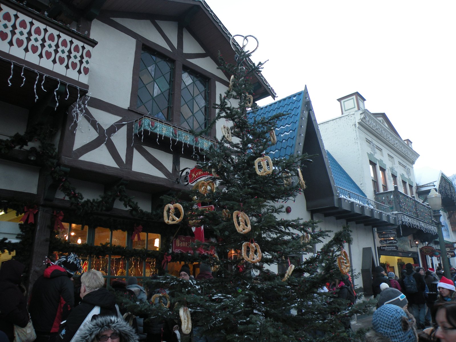 The town of Leavenworth was an old logging town - and on the verge of bankruptcy when the city council put their heads together and decided to turn it into a Christmasy Bavarian village - all of the store fronts were converted into gingerbread and the town was reborn into a tourist trap. It is very festive and fun - and we did our best to take it all in while we waited on the street for the nightly lighting ceremony. Children's choirs sang, the Mayor spoke, Miss Ornament/Tinsel/Candy Cane made an appearance and finally, at 4:45 they did the countdown...ten, nine, eight, seven, six, five, four, three, two, one...and nothing happened! There was a huge boo from the crowd - people yelled things like, "You should have paid the electric bill!" and "Put in some new batteries!" and "Didn't use a surge protector?" and my favorite, "Feed the hamsters!" Big disappointment all the way around...but we had strict instructions from the train people as soon as the lighting ceremony was over we had to make our way back to the busses and be on the train by 5:00 pm...we started to walk away when the lights came on!