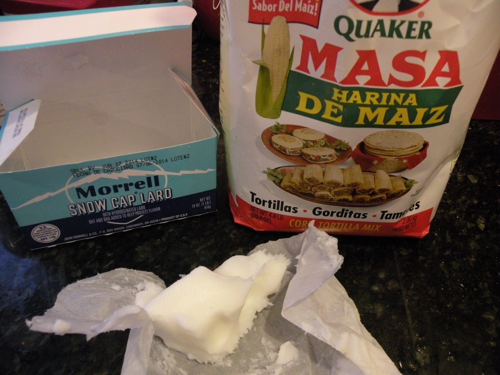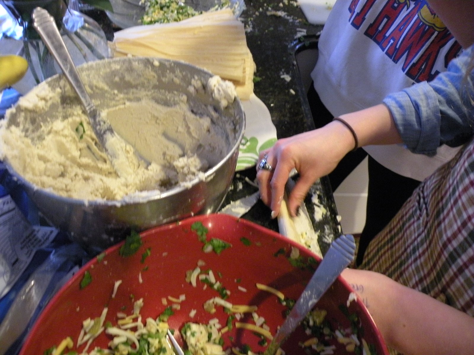 (The mister, who had to atone for his latest foible, was my masa errand boy and he had to go all the way to Kent to find a market that sold prepared masa! He was not amused.) We couldn't find any prepared masa in SLC so I used the dry stuff, mixed it with water, a little baking powder and lard and beat it until it was light and fluffy with enough air whipped into it so when a small piece of dough was dropped into a glass of water it floated - that's how you know it's good to go!