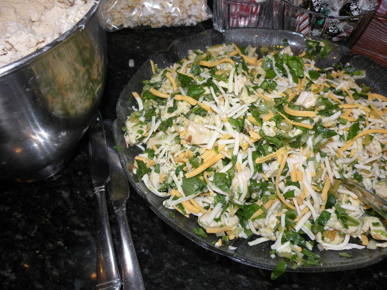 thrilled to do forced manual labor! That's Callie on the left, she is always smiling and her sister Gracie, on the right, is a growly-bear...but we love her anyway! Those two smeared the masa mixture onto about 70 corn husks and topped them with a mixture of chopped spinach, tomatillos, jalapenos, cilantro, green chilies, onion, cooked chicken and cheese...a little fiesta all rolled up in a corn husk!