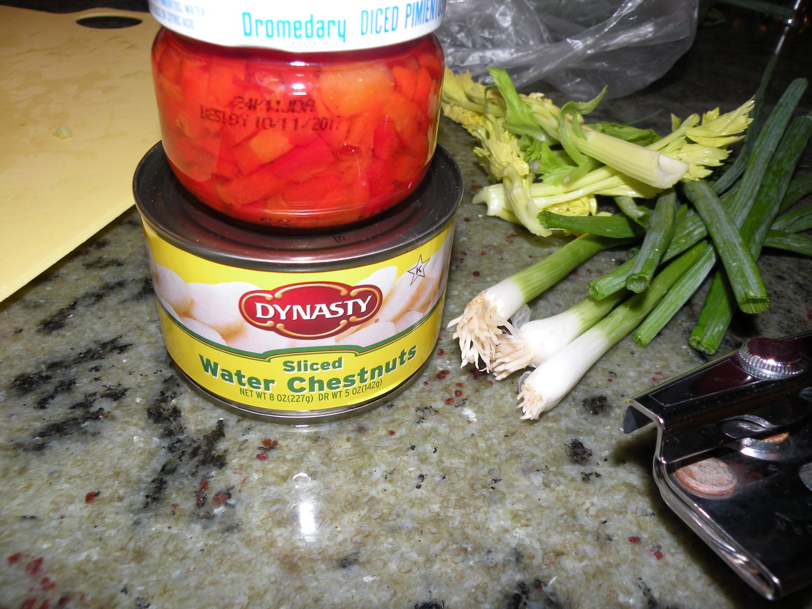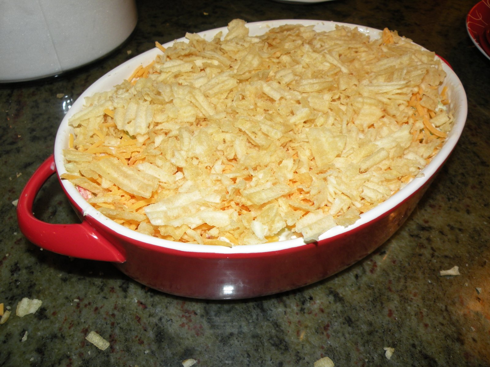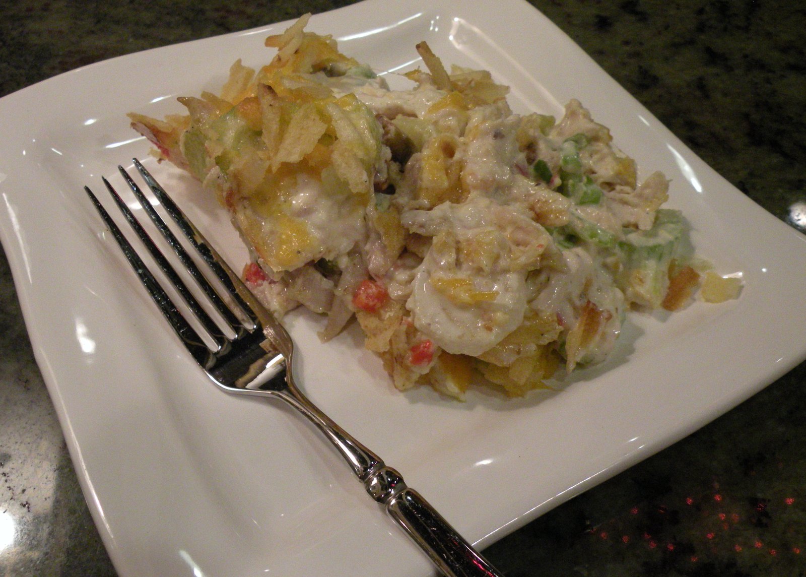 After our fun day at the beach, including the miracle that enabled us to make it back up the trail to our car without requiring oxygen or paramedics, and all of our stimulating conversation, I needed a drink! But I don't drink so I reached for the next best thing, Hot Chicken Salad - it's one of my very favorite comfort foods! It can be on the table, ready to eat in about 30 minutes...long enough to allow certain individuals time to calm down and write out a shopping list for Home Depot! If you like cold chicken salad you'll love this! Celery, pimentos, green onion, water chestnuts and slivered almonds...topped with cheddar cheese and potato chips! That just made you smile, didn't it? Crunchy, creamy, salty, cheesy - oh there's chicken in it, too!