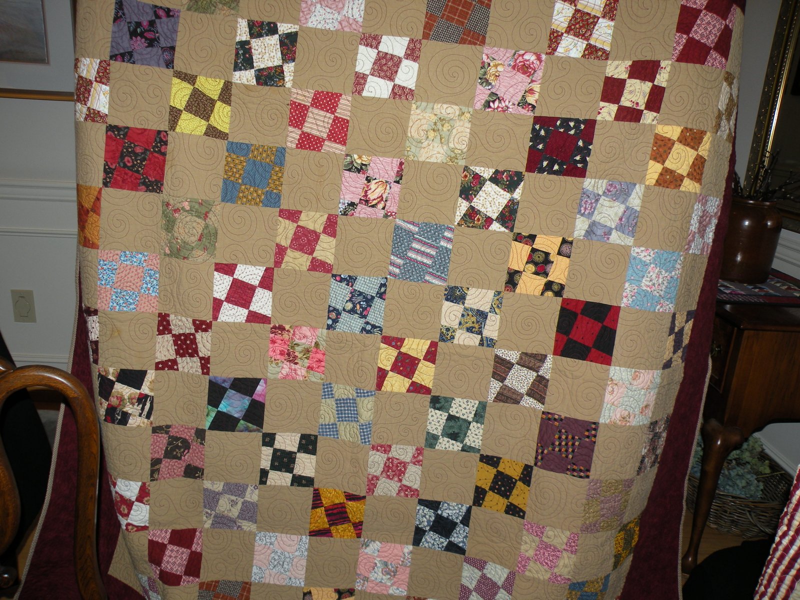 Actually, we started our meeting with a discussion on what type of project our group will do this year. We talked about doing a Round Robin, like the quilt on the left. That was the last Round Robin we did, and that's Helen's round robin. That project caused us all a lot of heartburn so we decided not to do that one again. Another time we all exchanged ugly 9-patch blocks - that's what we called them, we used our ugly fabrics to make and exchange 12 blocks each month. We all ended up with dozens and dozens of blocks and some pretty funky quilts. The quilt on the right above is one of two Helen made with her blocks. After much discussion we decided none of us wanted to sew 12 blocks each month. We finally agreed on the "My Month Project." We each will get a month were we tell the group what blocks we want them to make for us...and everyone will make one block a month for a year. We can surely do ONE block! Then each month someone will go home with 12 blocks that were made just for them - we've done this project before and everyone likes it so now we've got a plan for the new year!