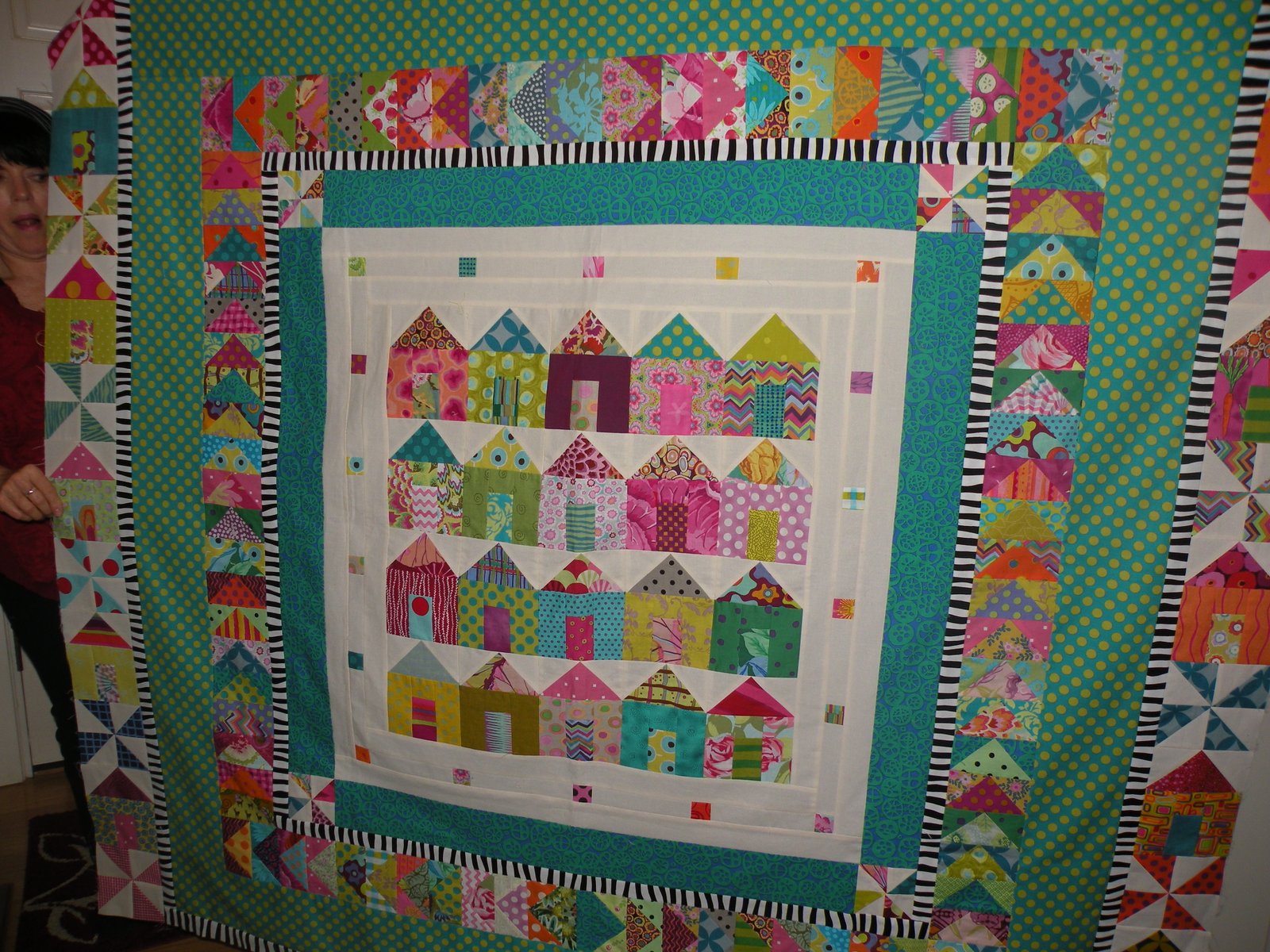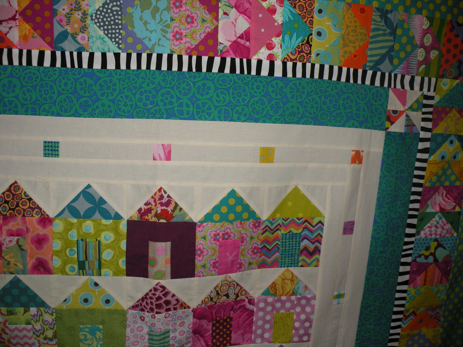 Helen's quilt is so her. Surprising. Aqua, pink with black and white stripes - and it works! Helen is a master-piecer, she never starts with a plan, she just lets it fly and the end result is always spectacular.
