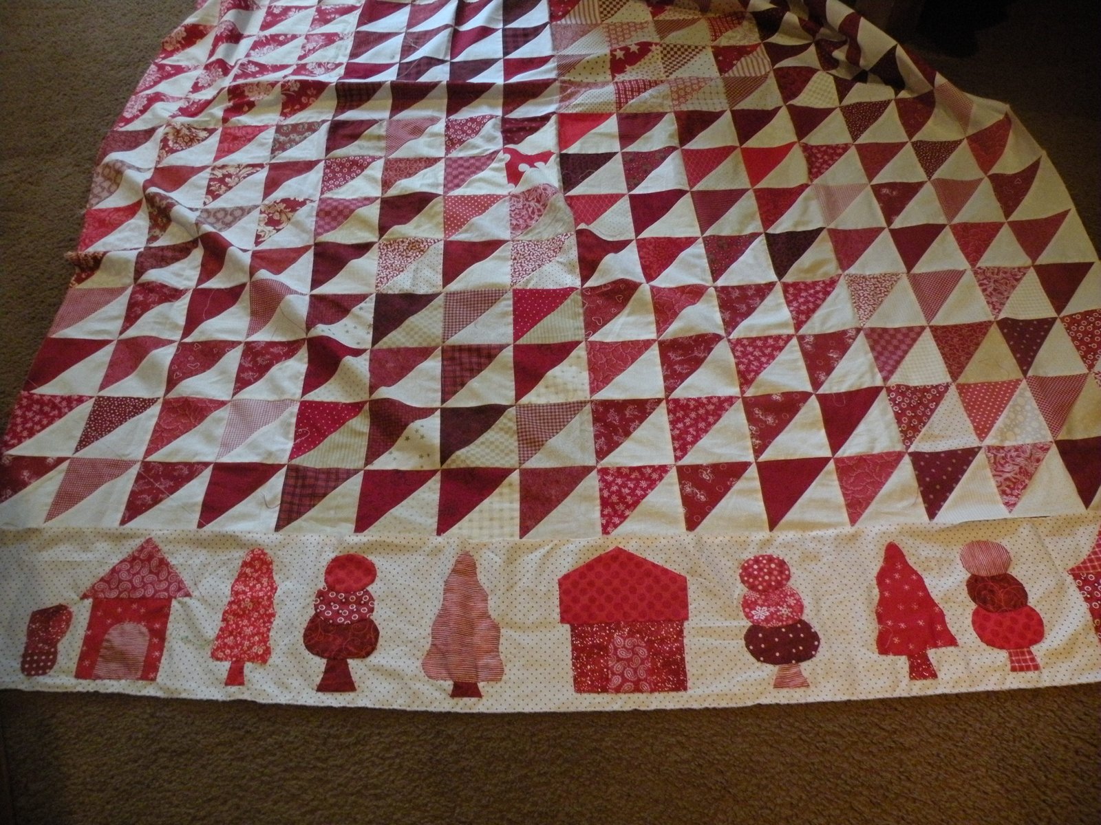 My red and white quilt, which was our last "My Month" group project, has been in the aging process for about two years now while I've been trying to decide what to do with it. After a lot of thought I decided to hand applique primitive trees and houses for borders on the top. I took the one finished border and the top to my meeting to ask my group what they thought and when you ask opinionated women for their opinions you get them! They suggested I ditch the appliqued borders (which I was all too happy to do because really, did I want to spend another year hand-appliqueing three more of them?!!?) and Helen found a perfect fabric in her stash that worked. I sewed on the fabric and love it and more importantly, it's out of the "aging basket" and on it's way to the quilter!! Thanks girls! Now, what do I do with the one appliqued border piece?!?