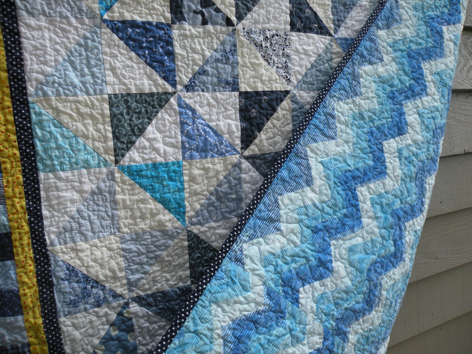 I've made just a couple of quilts with blue fabrics - it's not my color of choice and nothing in my home is blue so whatever blue quilts I make are usually for someone else. It's okay to give quilts away, it builds character. Feel free to quote me on that. If you've ever given away a quilt, even one you don't particularly love, then you know what I'm talking about! It's much harder than one would think...after spending weeks, months, sometimes years working on a quilt, it can be a bit painful to part with! But this quilt? Naw, no pain whatsoever would be felt because for whatever reason, this quilt does not speak to me.