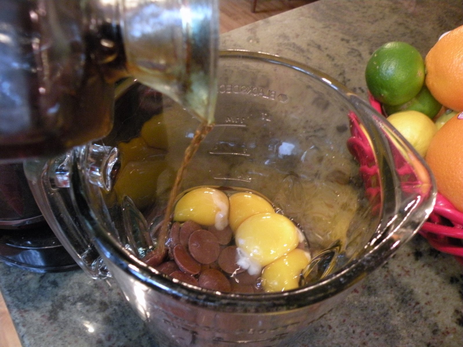 Put chocolate chips into the blender, add in the eggs and vanilla. Blend until chocolate is in little tiny pieces, about 30 seconds or so. Pour in the coffee slowly, with the blender running on high, and continue to blend until the chocolate has completely melted and is smooth. Pour into ramekins, pretty heart-shaped bowls or shot glasses. Refrigerate for 2 to 3 hours or until thoroughly chilled. When ready to serve top with a dollop of sweetened whipped cream. Makes about 2 cups, enough for 4 large desserts or 8 small...if you use shot glasses you'll get 16 servings!)