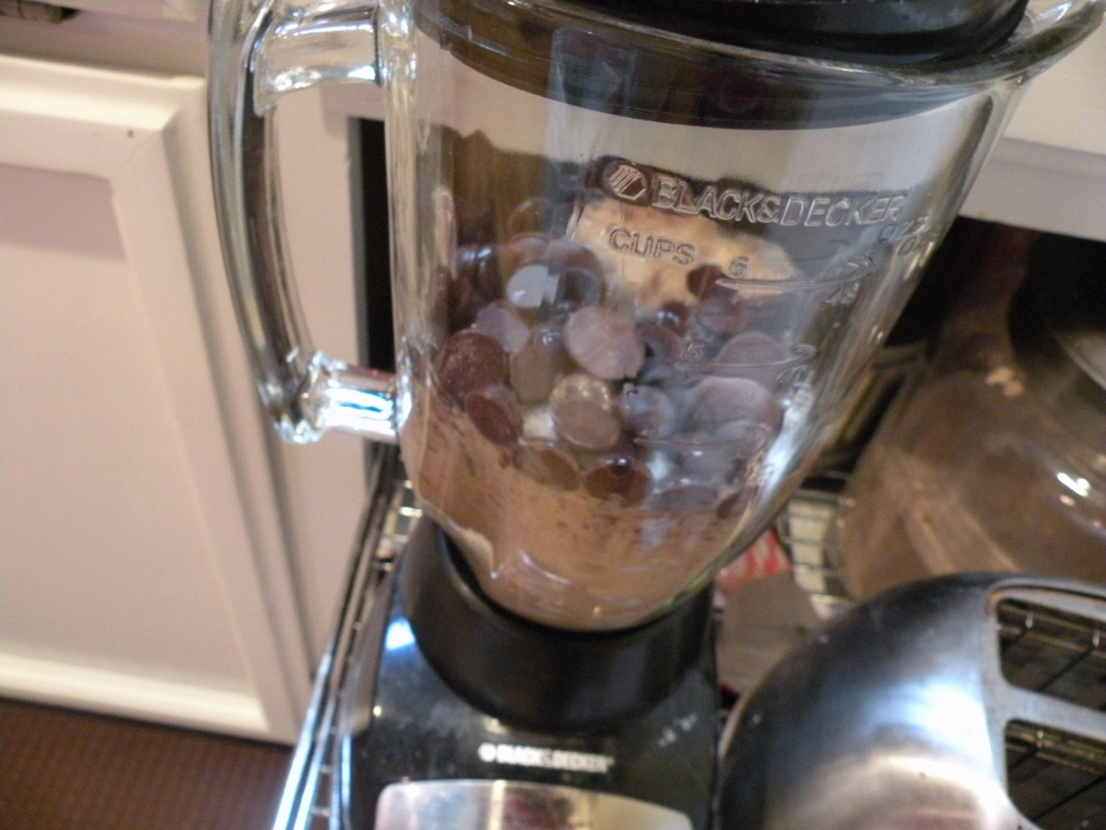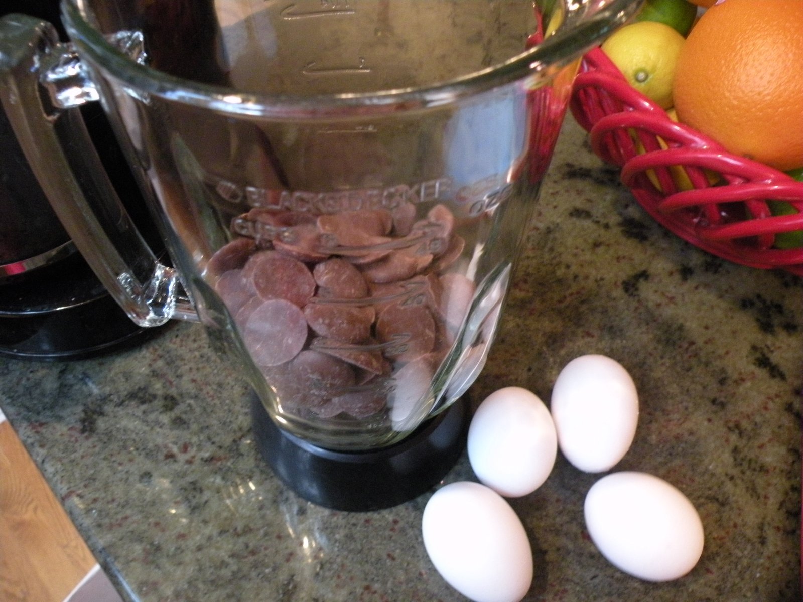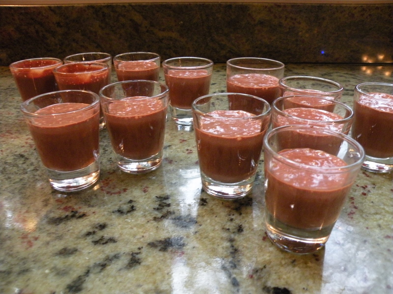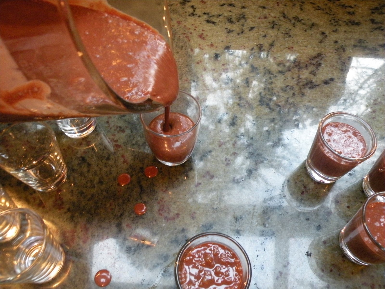 Pots De Creme, (pronounced poh-da-krem, it's French you know, and it mean cream pots - duh) is rich, dense and smooth. It's not a mousse - too thick for that - and it's not a pudding - there's no Jell-O-ish jiggle or meringue-sponge in this - it's just pure satin-y scrumptious. And it's all made in the blender! No cooking, no fuss! Put in the chocolate, add the eggs and then pour in strong, hot coffee...blend till smooth and you're ready to pour into whatever cute Valentine dish you have...or if you're serving a crowd, you can fill up cute little shot glasses. Two bites is good, or course three or four would be better but two bites will satisfy even the most devoted chocoholic.
