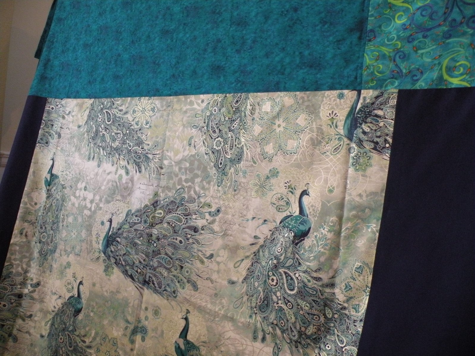 This amazing piece of work was made by Jenny. Just look at all of those triangles! This is so pretty in person - and it's quite big - and Jenny made it for a wedding gift so she's giving it away! The back was just as pretty as the front - it's pieced with a beautiful peacock fabric...