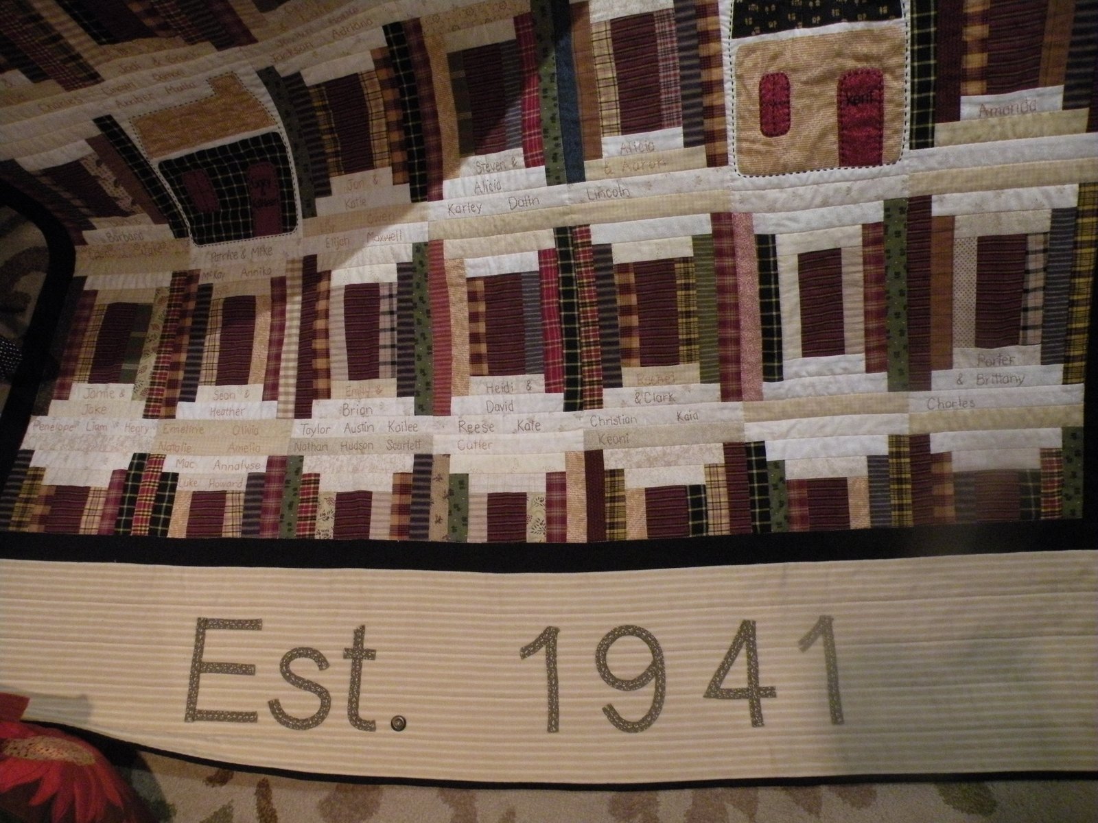 This is one LONG quilt! Lori made this for her mom many years ago and I think I might have shown it to you way back when but it's definitely worth another look. Lori's mom and dad had seven children, so there are seven vertical rows in this quilt with a house in each row - each row represents one of those children. Above and below those houses are blocks that have been embroidered with the names of grandkids and great-grands. I don't remember how many great-grands there are, but it's in the hundreds! Every time someone had a baby, Lori embroidered their name on the quilt - now this is a real heirloom!
