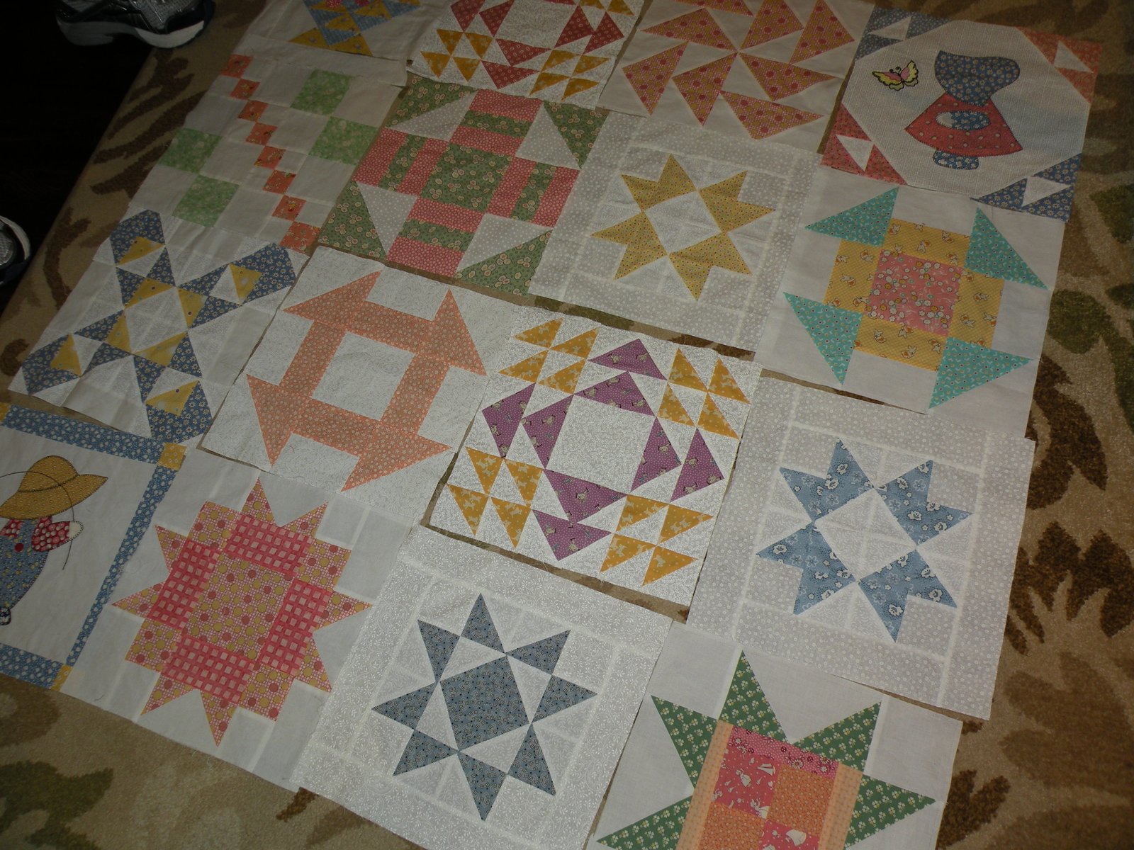 Years ago our group made blocks for Marsha - and she still hasn't sewn them together! What's the hold-up, you ask? Well, it could be that most of the blocks are different sizes...or the points were cut off...or the colors were wrong...but after playing with different fabrics and moving things around, the group gave Marsha some ideas on how to finally get this one sewn together!