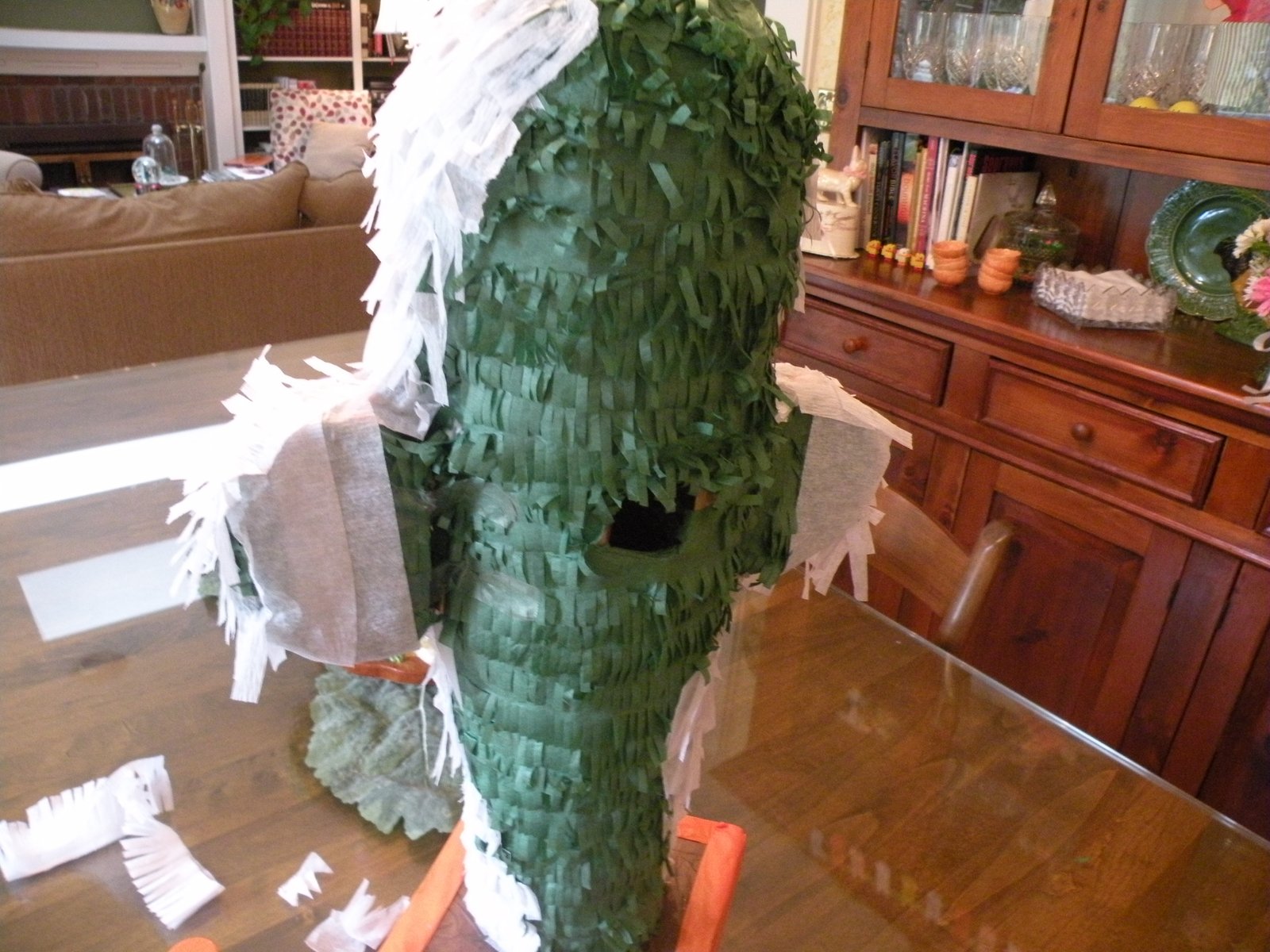 Thin strips of crepe paper that had been hand-fringed...also known as cut with scissors, were glued on with Elmer's glue. Hand-fringed is a pinata-maker's technical term, as is dotted adhesive so as not to allow moisture to permeate the crepe...I was warned by a "pinata expert" at the party store (because that's where unemployed pinata-makers go to find work and share their vast knowledge of pinata making) that the last thing I wanted was permeated crepe!