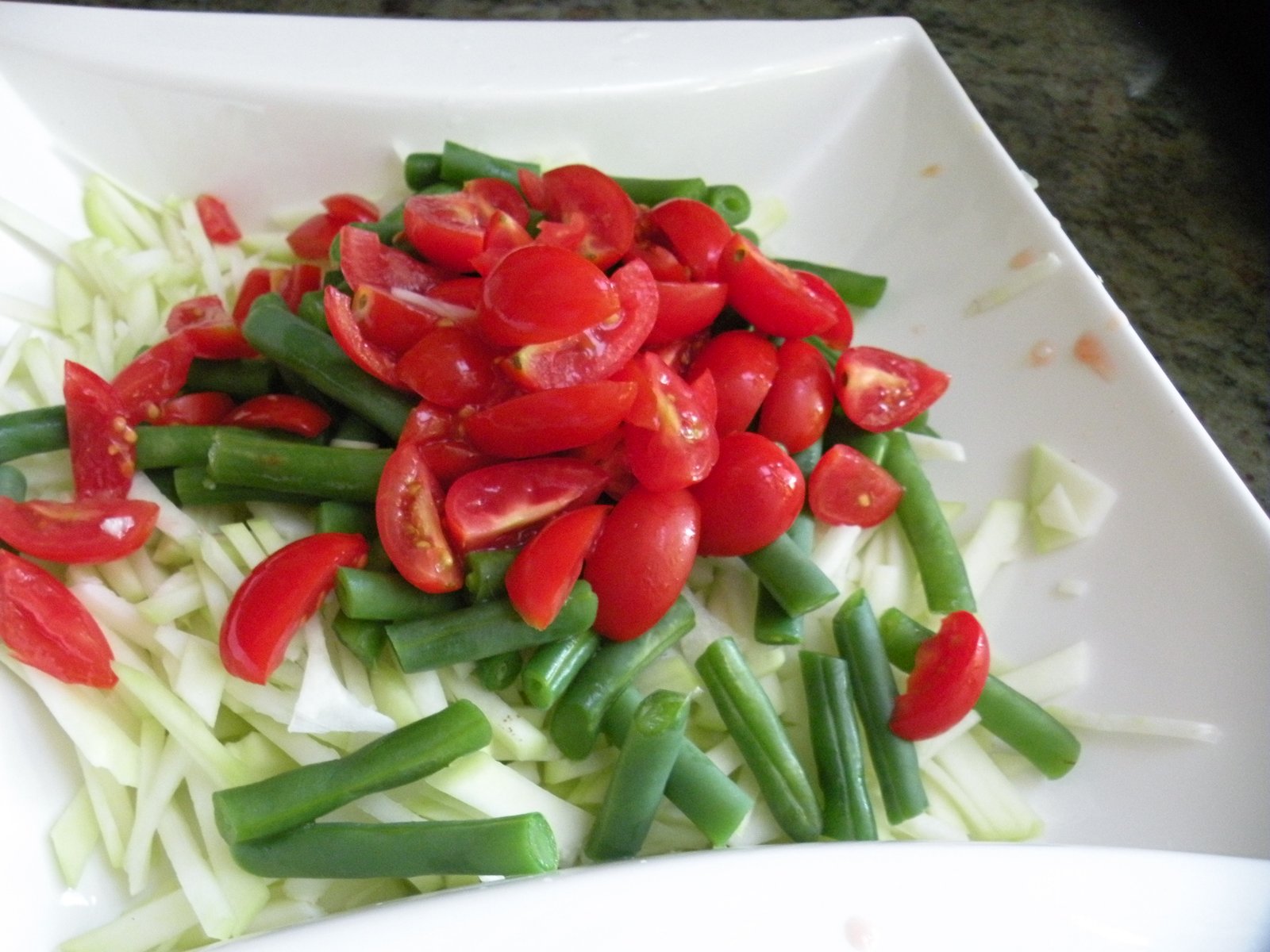 Fresh green beans that have been blanched for a few minutes, mix with the papaya, tomato, green onion and basil - crispy and crunchy - two requirements for a salad, no? But that's not all...the salad is topped with peanuts and an Asian dressing that will have you begging for a spoon so you can scoop up every last drop!