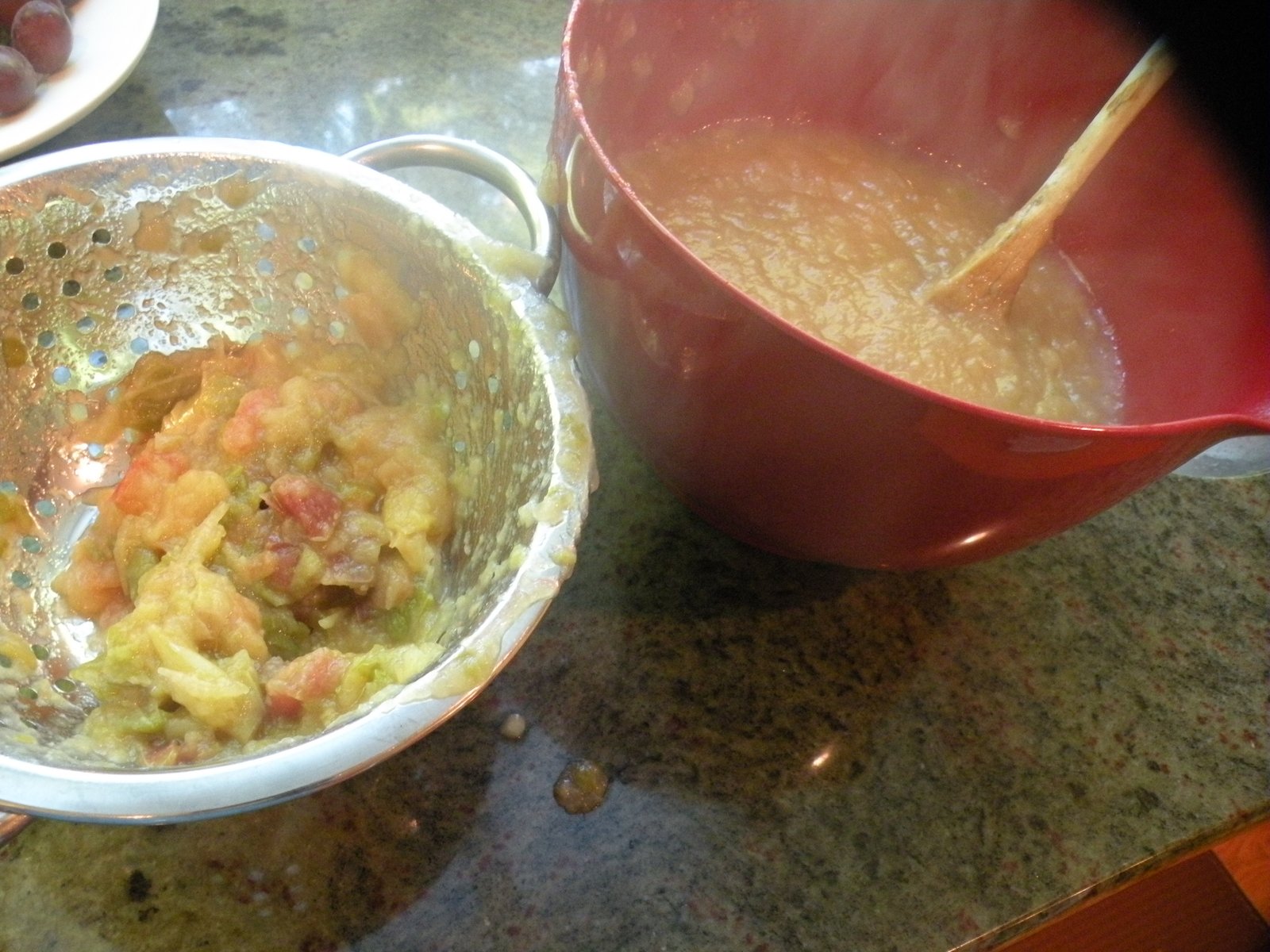 Martha recommends using a food mill, but since I don't have one I used a strainer and wooden spoon and it worked great - notice in the pic on the right how few peels are left in the strainer! If you use mostly red-skinned apples the applesauce will be more pink.