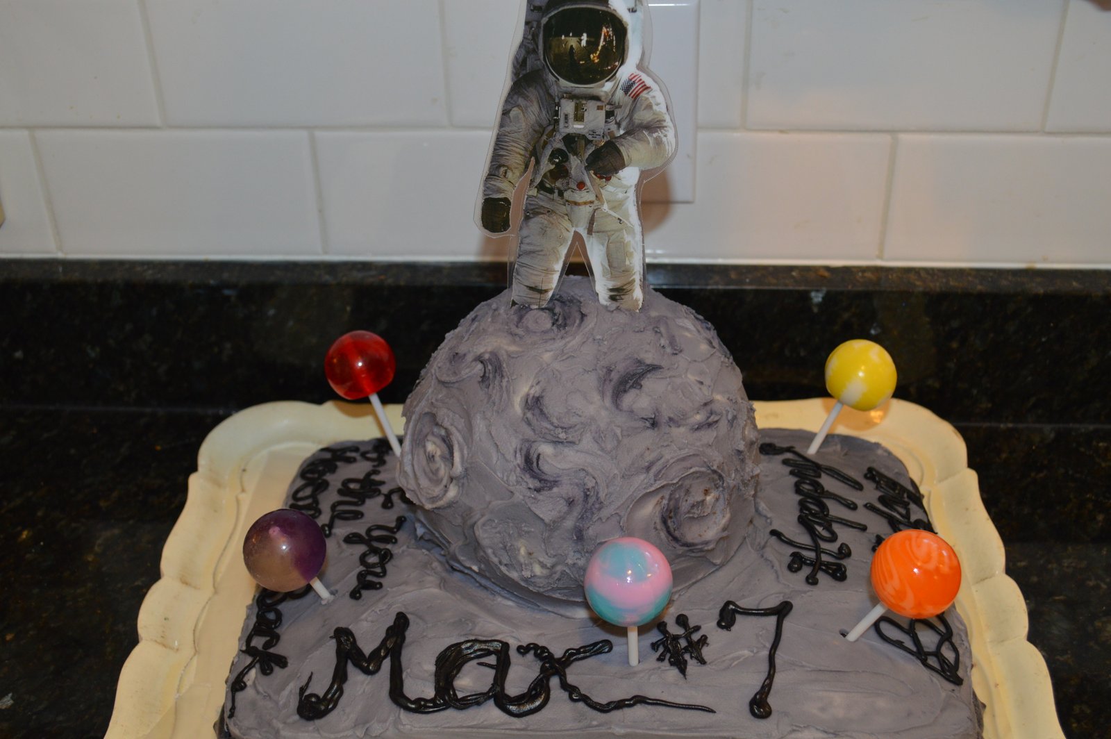 Max's cake was made with a Devil's Food Cake Mix, he loves chocolate cake. When he saw the cakes after they were baked, he said, "Oh, so I'm going to have a brown moon cake?" I told him there would be frosting on the cake and he requested gray frosting, like the moon. I tried. Turned out a little darker than I wanted but oh well! I set the "moon" on top of a 9x13 sheet cake because I didn't think one little ball of cake would feed 12 people - and I was wrong! All 12 of us had a nice sized piece of cake with ice cream and there was still cake left in the moon part - we didn't even touch the bottom cake!