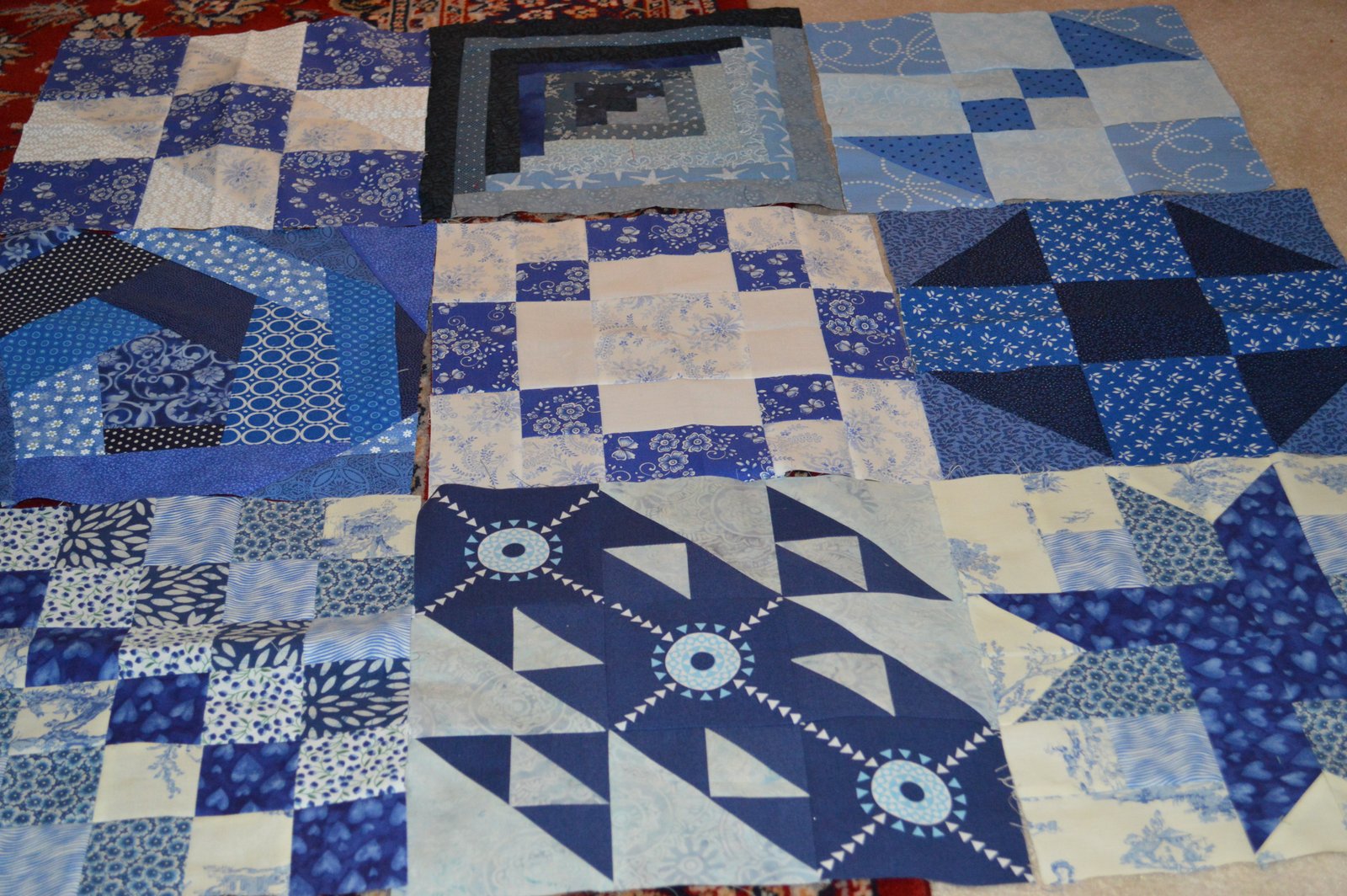 This month we were supposed to make blue blocks - this is what everyone came up with - they will be sewn together in some fashion and then the quilt will be donated to charity.