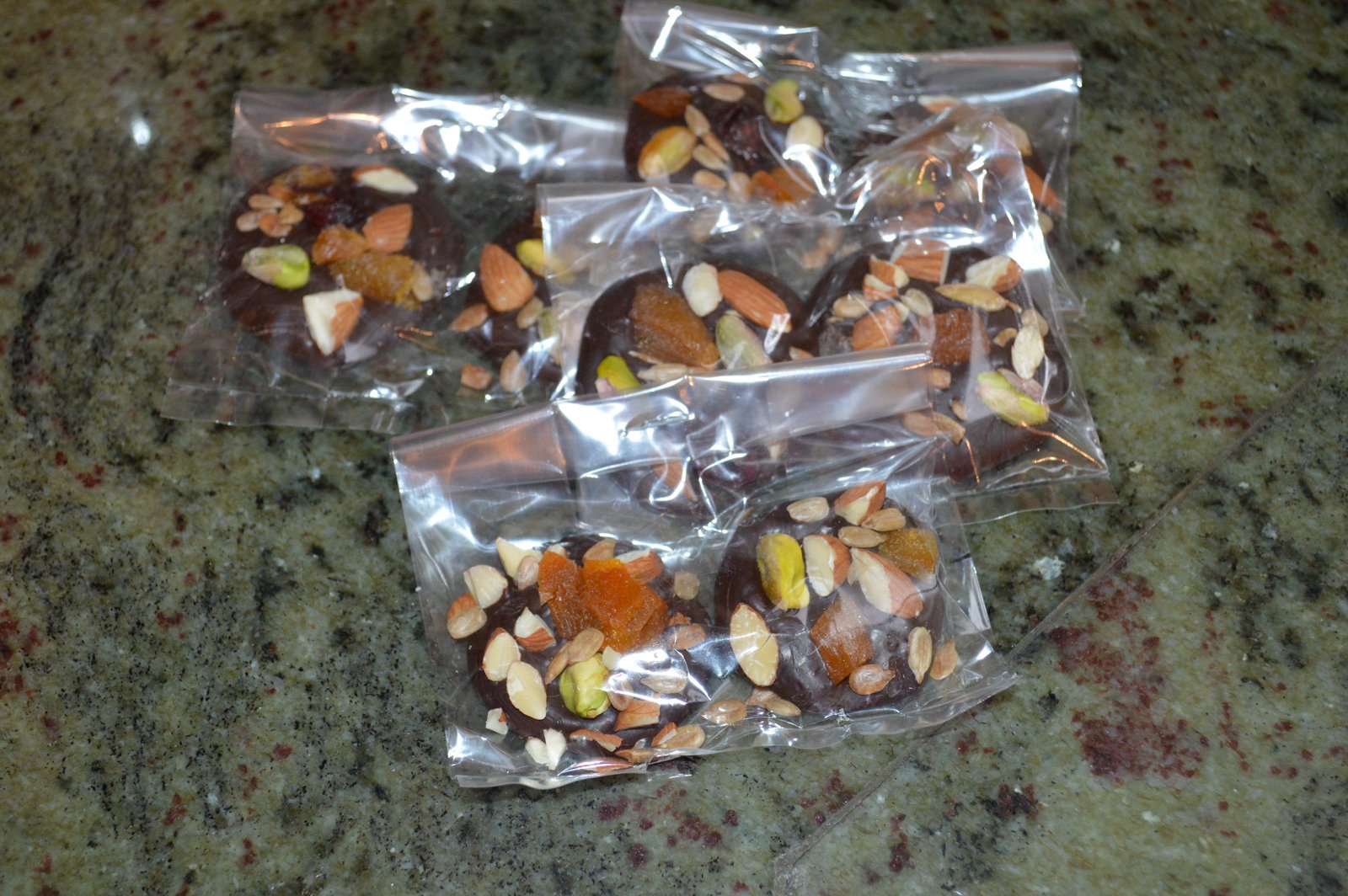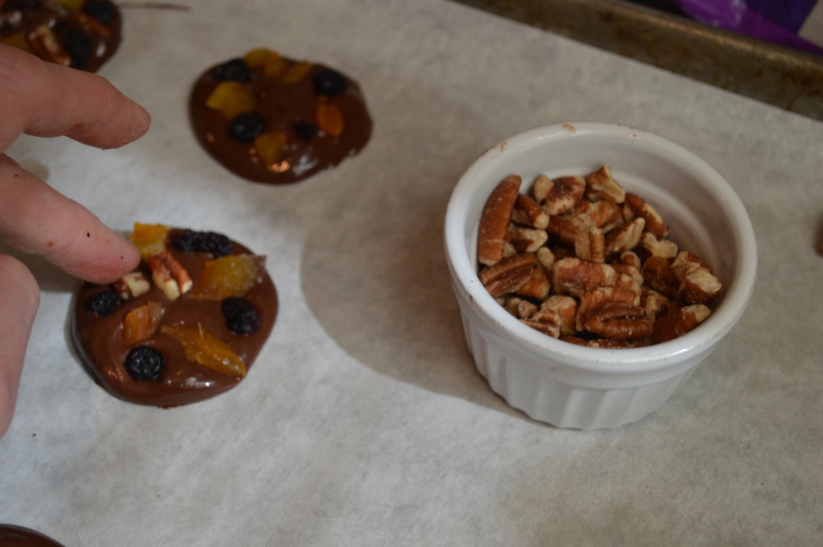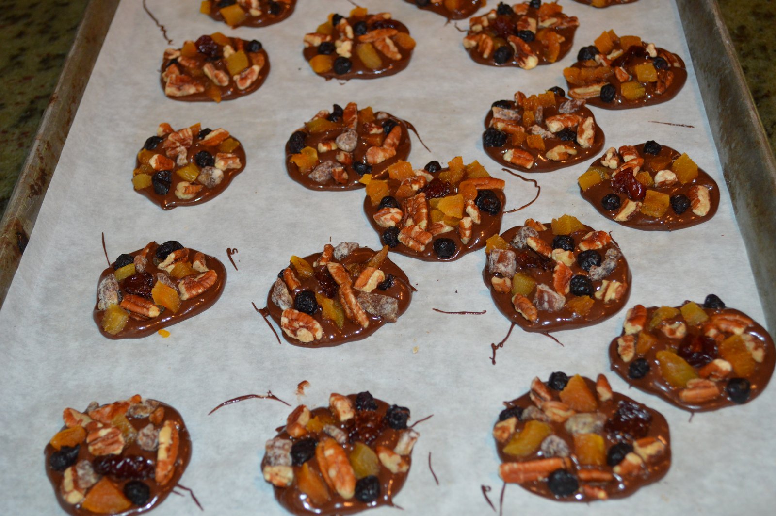Put chocolate in a microwaveable bowl in microwave and heat on high for 30 seconds. Remove and stir. Return to microwave for an additional 30 seconds, remove and stir until melted completely and smooth. On a sheet of parchment, spoon out a heaping tablespoon of chocolate and swirl into a circle, about 2 inches across. Add dried fruit pieces and nuts, pushing into chocolate gently. (I make 4 circles at a time, add the fruit and nuts to them, then make 4 more, etc., until chocolate is gone. Don't ask me why, it's just what I do!) Allow to set until chocolate is firm and completely cool, about 1 hour. Keep in plastic bags/container to keep fresh, or wrap individually. Makes about 20 to 22.