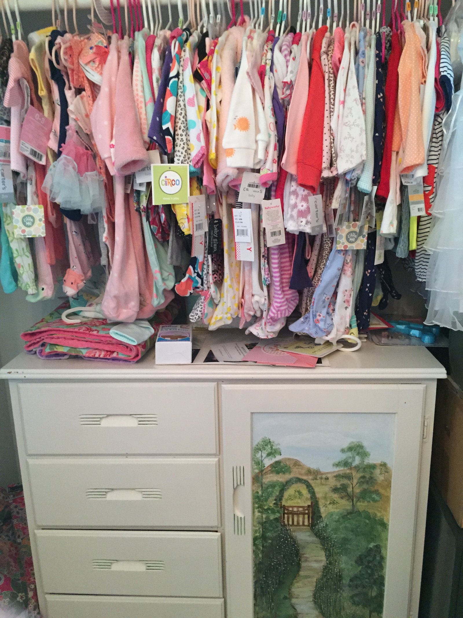 This is the dresser I gave to my niece - I painted the dresser white (it used to be brown) and painted the picture on the front years ago, and so I love this little dresser and wanted it to go to someone who would love it, too! Gabby has it in Rylee's room, in the closet - and while I think it should be prominently displayed in the room, alas, while Rylee's room is elegant and beautiful, it is small so the closet was the only place for the dresser! But, that being said, the dresser is being used and was needed! Every drawer is filled with something...the top drawer is filled with baby booties and shoes, the second drawer is filled with socks of every color and so on...as you can see by the rod above the dresser - little Rylee does not lack for clothes! Gabby had about 4 baby showers so Rylee is THE best dressed baby in all of Wyoming - well that's not saying much, Rylee is probably the best dressed baby in the West!