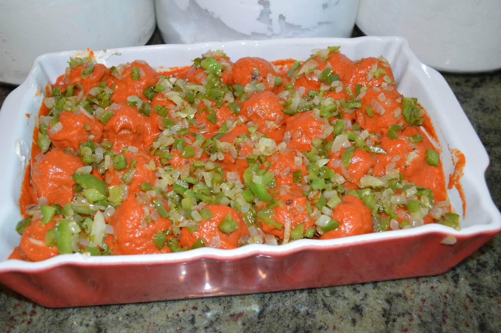In a large skillet, heat olive oil. Saute diced onion and green pepper until onion has softened, about 6 to 8 minutes. Remove from heat and spread onion and peppers over tops of sauce/meatballs. Sprinkle with remaining cup of cheese**. Bake in 350 degree oven for 35 to 45 minutes, or until bubbly on top and cheese has melted. Remove from oven and serve hot. Serves 6.