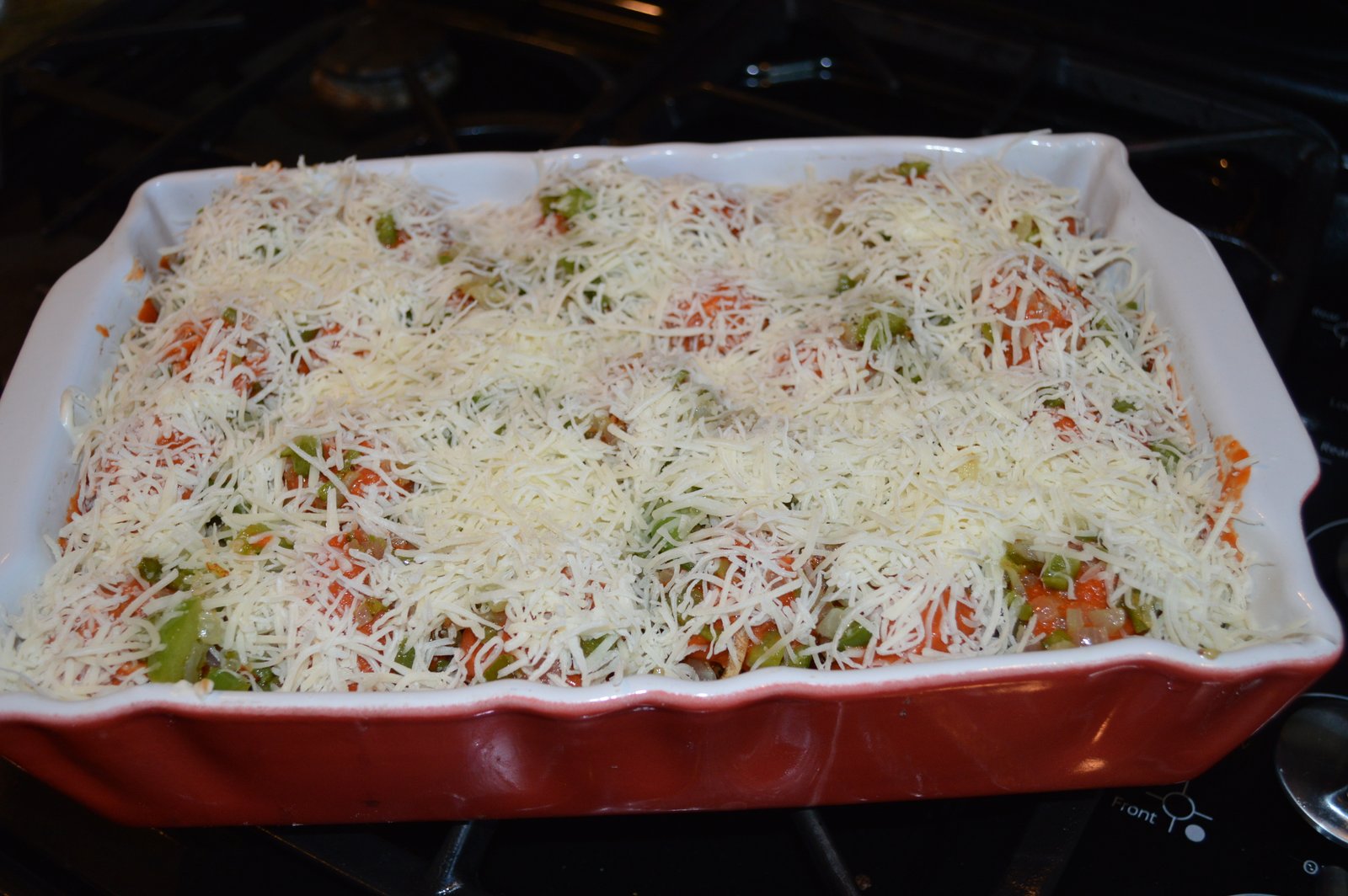 **If you decide not to bake right away, at this point you can cover with plastic wrap and keep in refrigerator over night and then bake the next day, and add an additional 5 to 10 minutes to the baking time. You can also freeze the casserole after it is assembled. Cover with foil and freeze for up to one month. To bake after freezing, place foil-wrapped casserole in oven and bake for 40 minutes, then remove foil and bake for an additional 15 minutes, or until bubbly and cheese has melted and it is heated through.