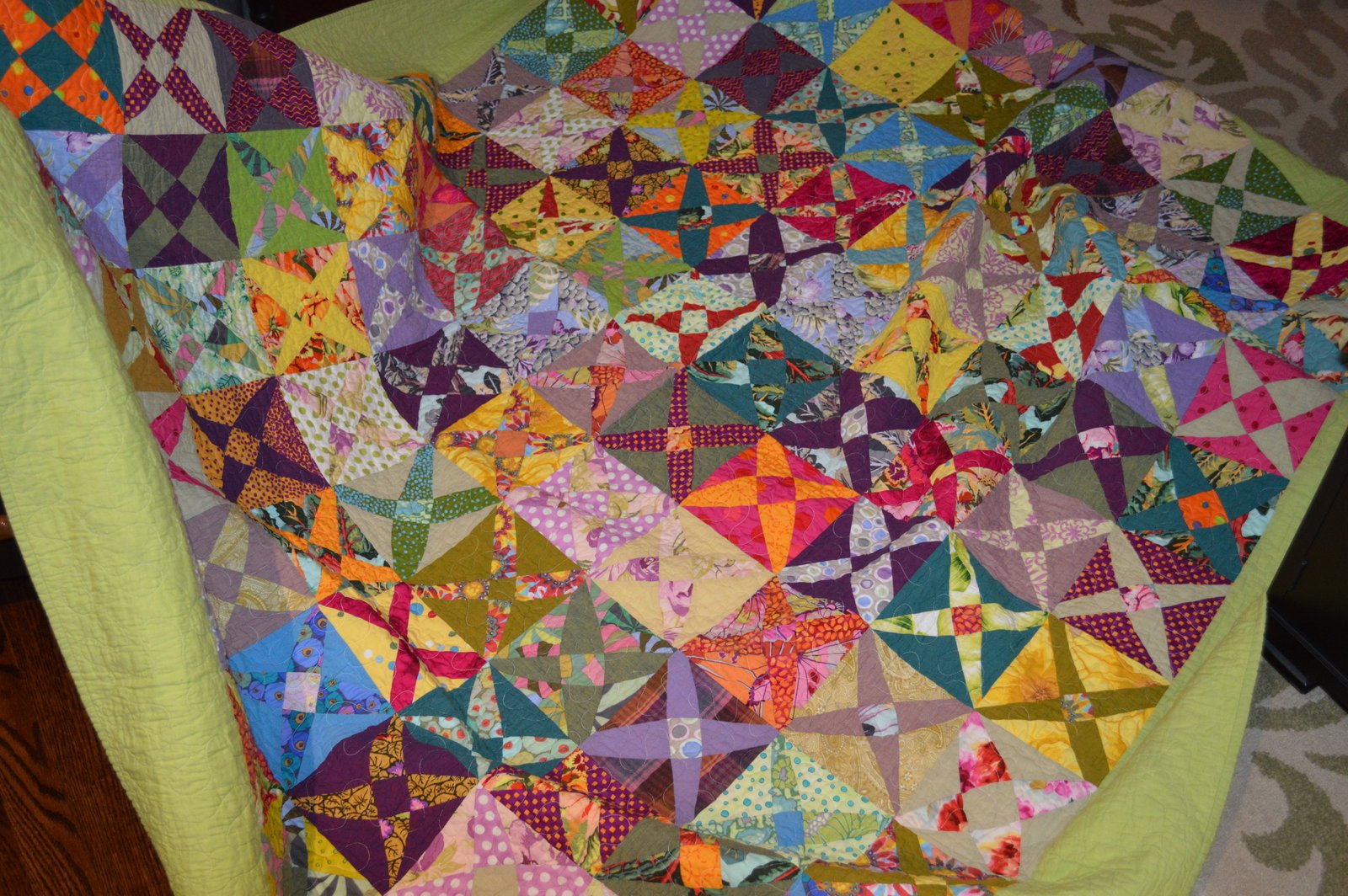 Helen made this quilt in 2005, so it hasn't been seen on here before because my blog is only 8 years old! (8 years of blogging - seems like forever yet not - wonder what the expiration date is on writing blogs!?) I thought I had photographed all of Helen's quilts but this one escaped! This quilt was featured in one of Sujata Shah's books. Sujata is a master quilter - but in a free-spirit kind of way - she has a new book out, check it out on Amazon by clicking here . Helen and Sujata are friends, I think they met in a quilt class and they both have this unique style and a way with color...the two of them must have stood in the Genius with Color line in Heaven.