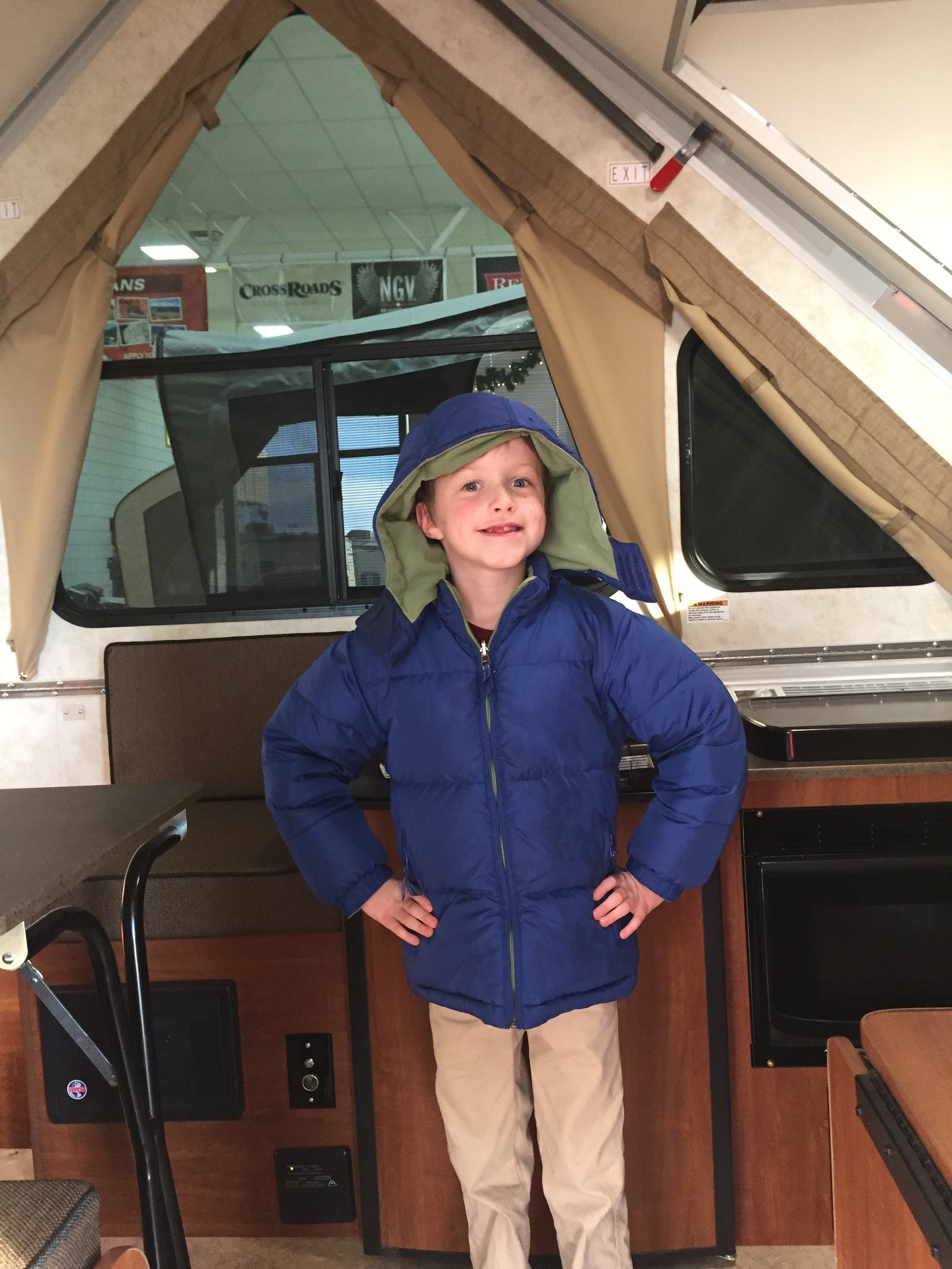 Elsa helped with decorations - she is Little Miss Christmas! And Max, well, his latest obsession is trailers - pop-ups, campers, travel trailers, motor-homes...so we took him to some dealerships and you've never seen a happier child. He is standing inside his favorite pop-up, with a "dinette" and two "bunks"...if only I could fit one inside his stocking!